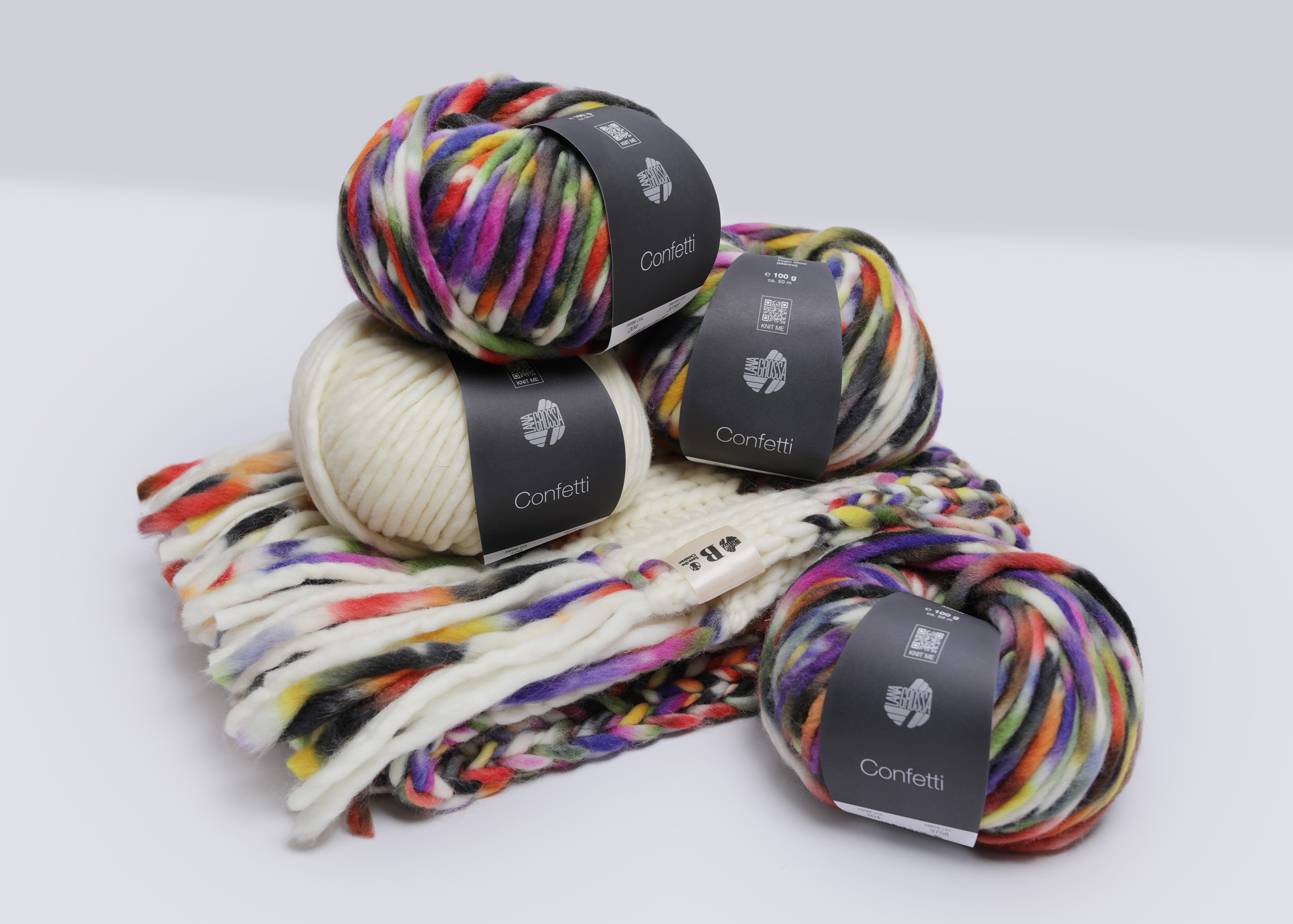 Lana Grossa, qualità “Coriandoli” (100% lana vergine (Merino), LL 50m/100g): 300 g nel colore 204 (bianco, arancione, giallo, rosso, grigio, mela, verde scuro, viola, blu-viola maculato) , 100 g nel colore 109 (bianco grezzo)