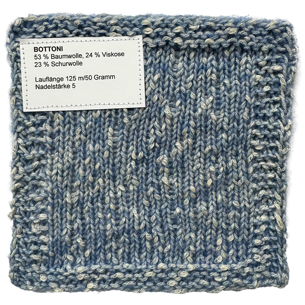 Bottoni ha un carattere speciale: al suo interno unisce una morbida miscela di cotone e viscosa, avvolta da un sottile strato di delicate fibre di merino. Piccoli fiammati sparsi creano accenti giocosi e donano al filato il suo look vivace e inconfondibile.