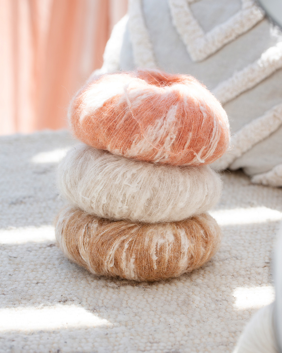 57 % Lana vergine merino, 20 % Mohair, 23 % Poliammide
