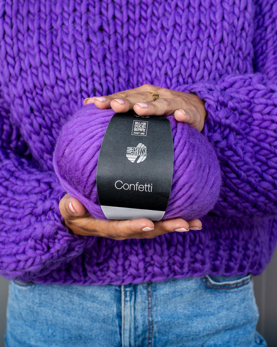 Confetti è un filato stoppino spesso come un dito in 100% lana merino fine, che con il suo esclusivo effetto fiammato crea capi vivaci e divertenti. La struttura morbida e voluminosa dona una maglia chiara e rustica – perfetta per maglioni alla moda, berretti, sciarpe o accessori di carattere. Le colorate fiammature sono come piccole spruzzate di colore nel filato e rendono ogni pezzo un capo unico e originale.