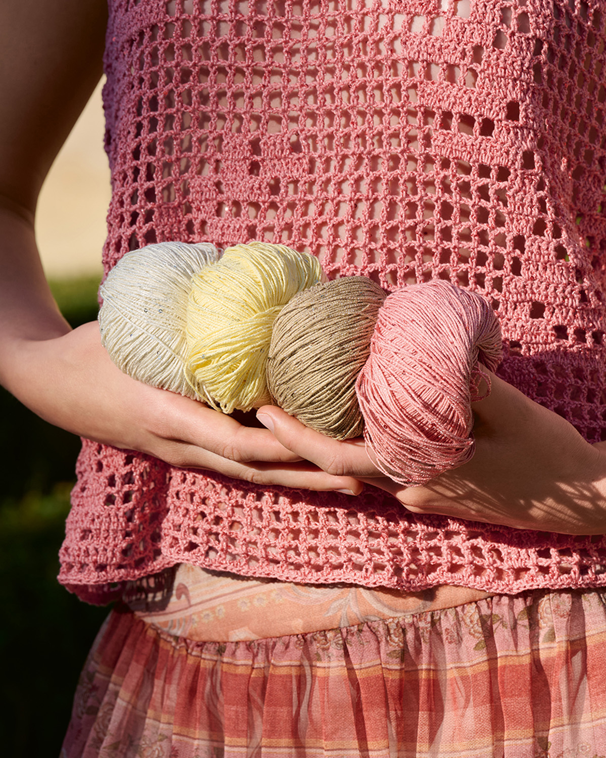 Fili di cotone di alta qualità vengono intrecciati insieme a un filo di minuscole paillettes per formare un filato sottile. Tinti tono su tono, creano delicati riflessi scintillanti.