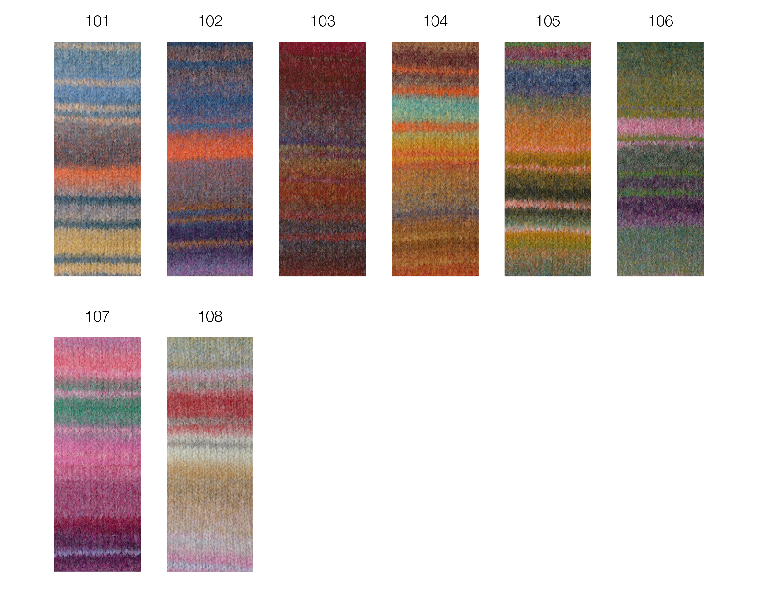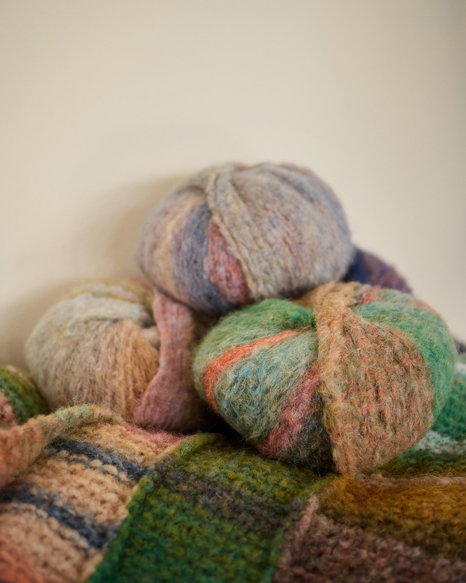 Filato di alpaca voluminoso con struttura ad effetto in un mix di strisce colorate.