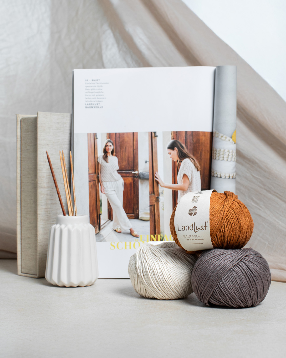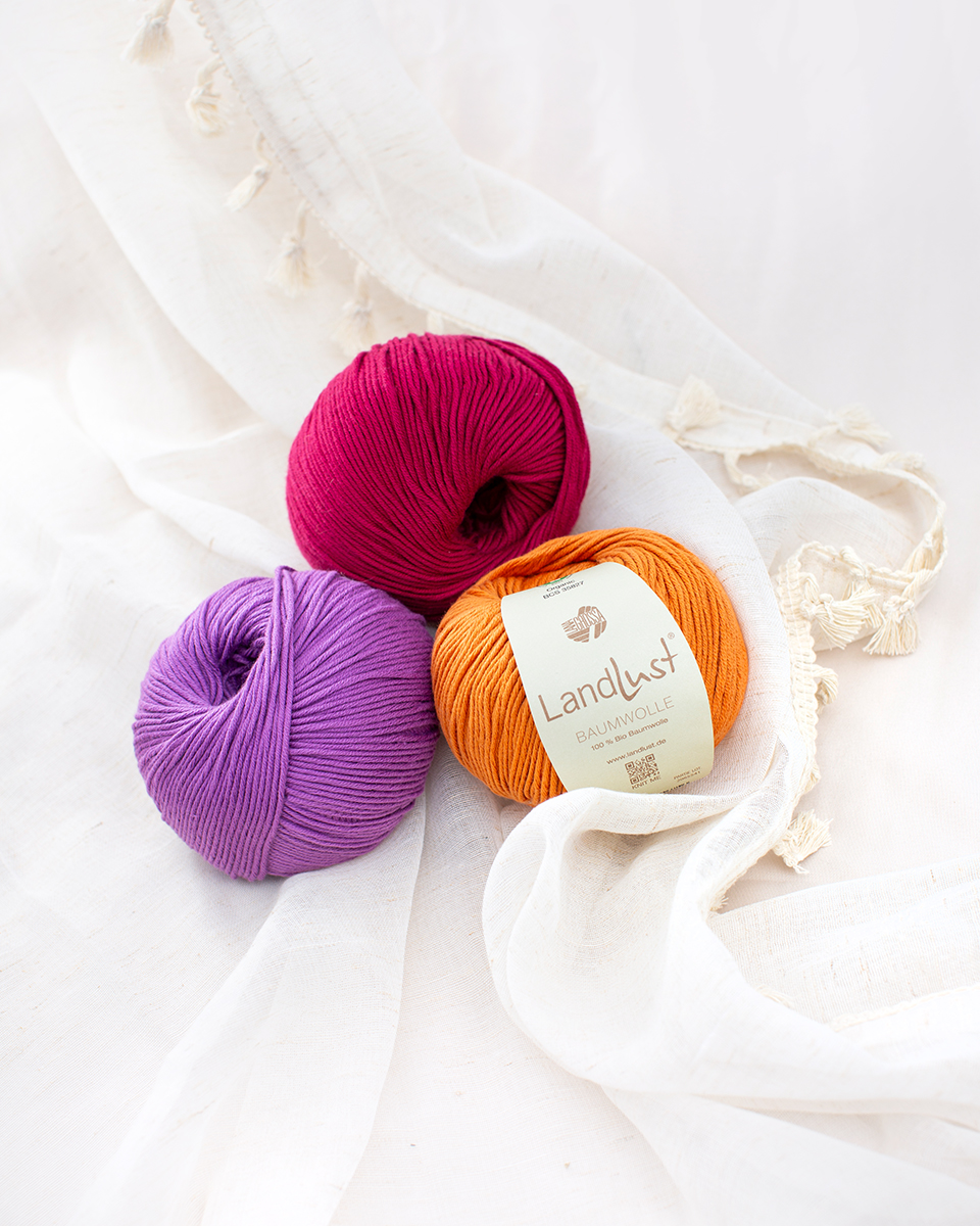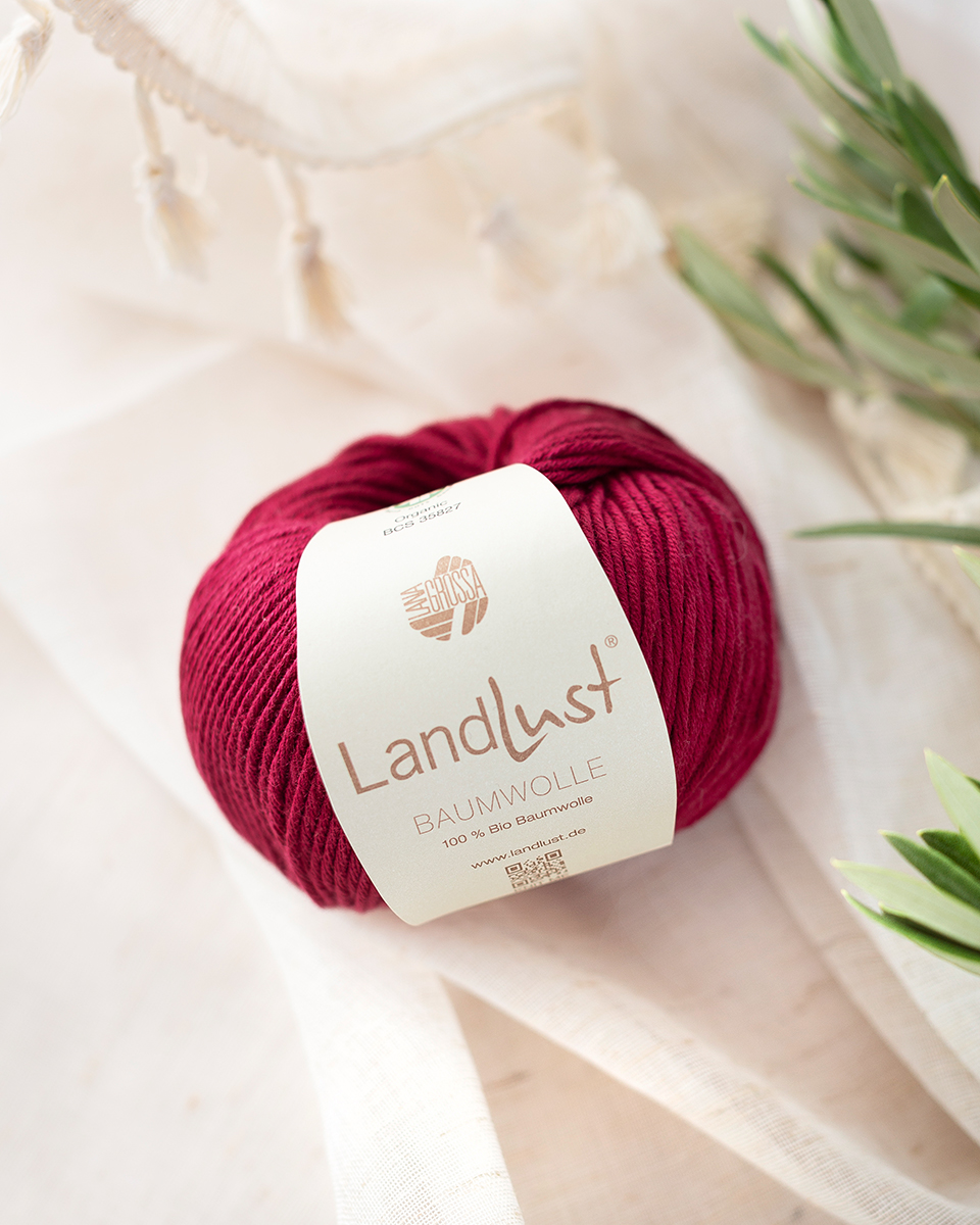 Landlust Baumwolle è un filato naturale e morbido in 100% cotone biologico, sviluppato in collaborazione con la rivista Landlust. Presenta una maglia piacevolmente compatta e definita. Grazie alla qualità biologica certificata GOTS e delicata sulla pelle, è ideale anche per le pelli sensibili.