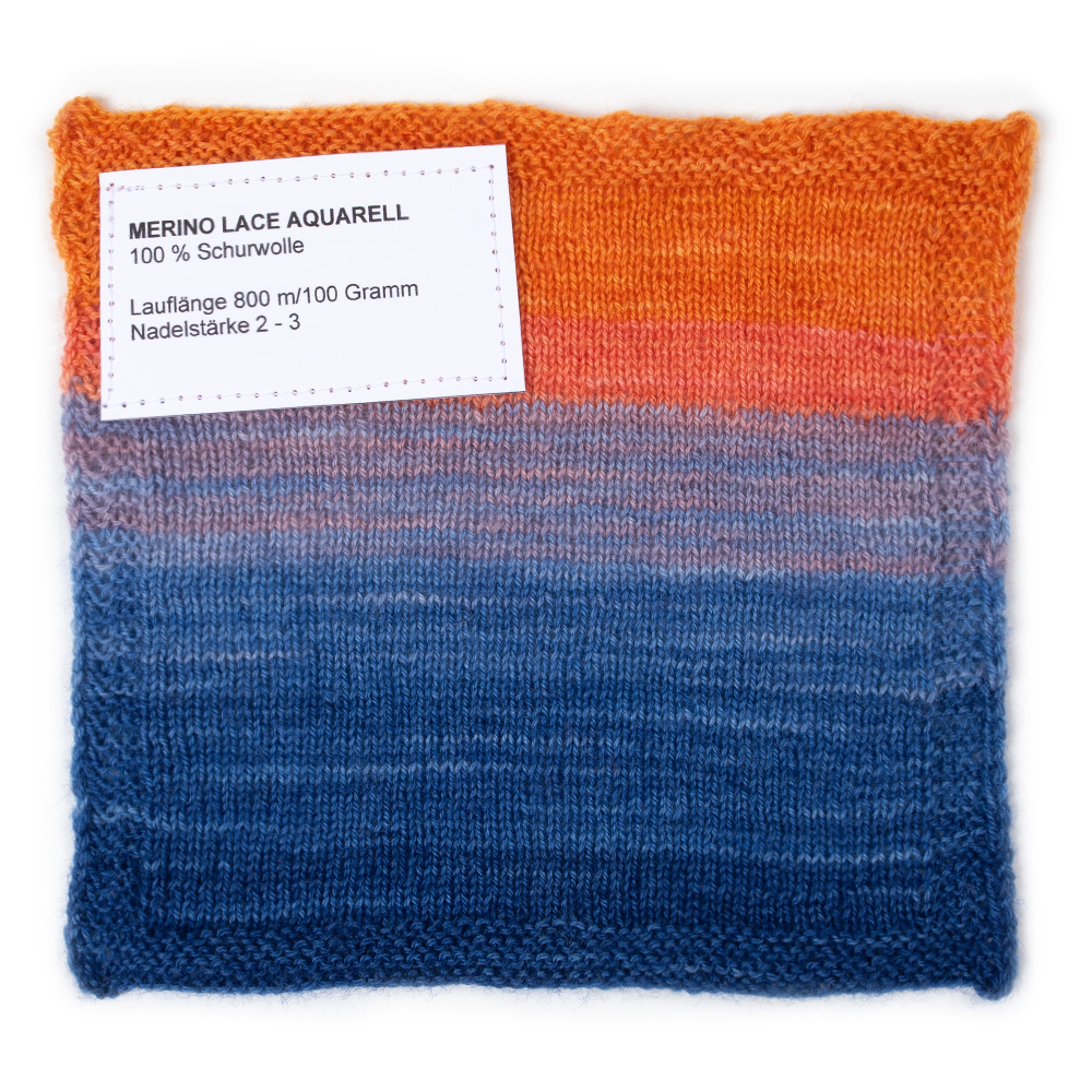 Merino Lace Aquarell unisce qualità pregiata e giochi di colore artistici: realizzato al 100% in lana merino, questo filato lace si distingue per la sua struttura particolarmente morbida e leggera – perfetta per scialli delicati, eleganti stole o maglie raffinate. Il punto forte è la sfumatura acquerellata, che dona a ogni creazione una vivace delicatezza. Le transizioni armoniose scorrono tra toni più tenui e più vivaci, sempre uniche e speciali. Grazie alla finezza del filato lace, è ideale per motivi traforati e design ariosi.