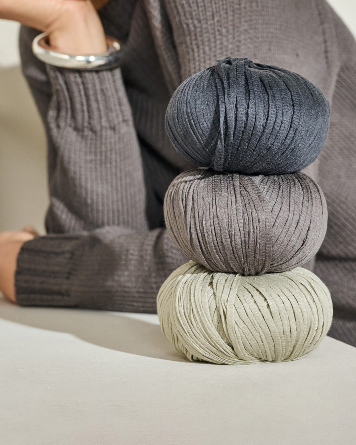 Le delicate fibre di cotone vengono lavorate per ottenere un filato di cotone sottile, il cui aspetto opaco, simile alla carta, gli conferisce un carattere pulito e unico.