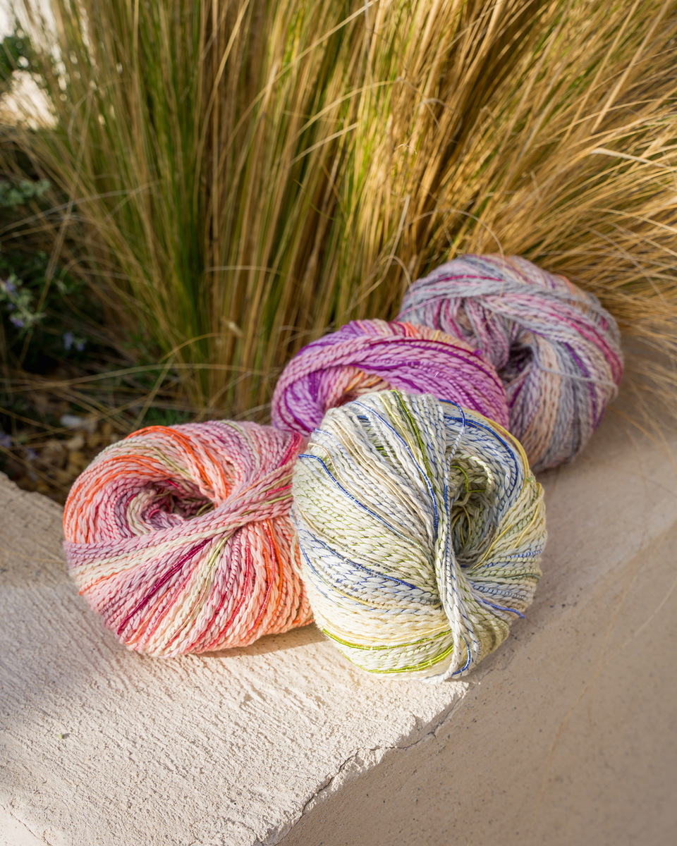 Filato effetto cotone con effetto double color, avvolto irregolarmente da un filo sottile e lucente.