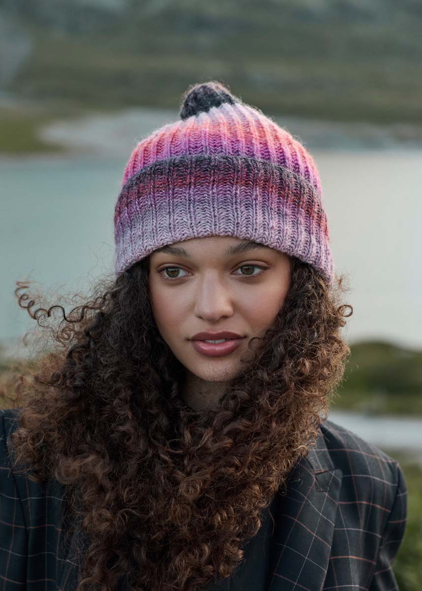 Lana Grossa, qualità “Gomitolo Fumo” (50% lana verine, 50% poliacrilico, 200 gr. = 700 mt.): 200 gr. col. rosa pallido/rosa/pink/rosso-viola/grigio-chiaro-scuro/ terra cotta n. 513; ferro circolare corto e/o gioco di ferri n. 4