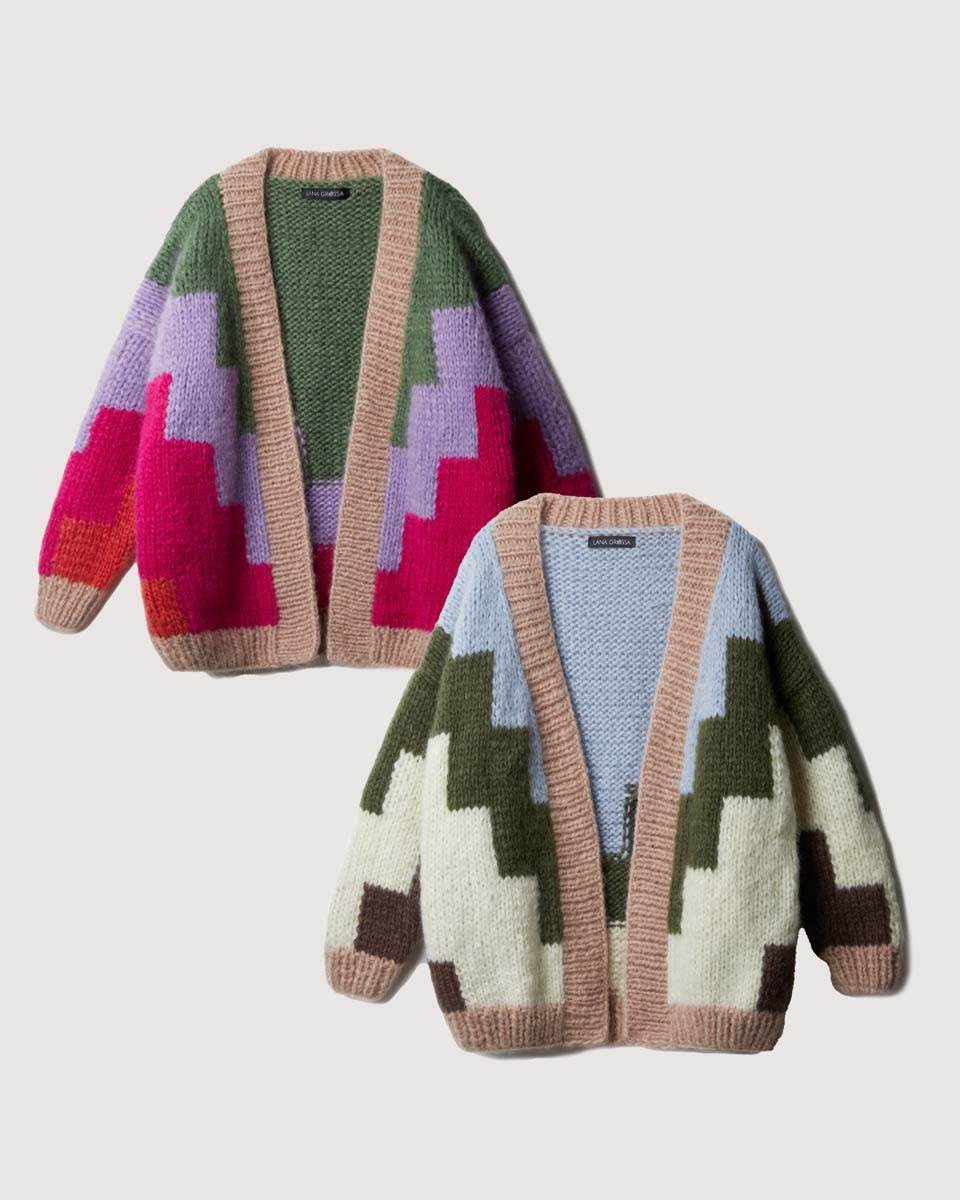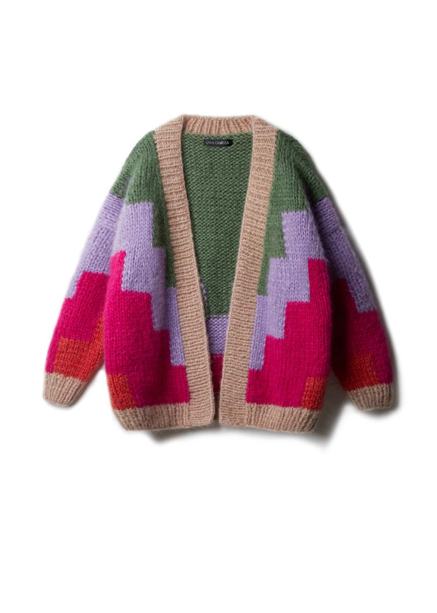 Lana Grossa, qualità Mohair di Gio (55% superkid mohair, 45% lana vergine merino superfine, 50 gr. = 85 mt.): 300 (350 - 400) gr. col. pink n. 3, 200 (200 - 250) gr. nei colori beige n. 8 e lilla n. 1, 100 (150 - 150) gr. col. pink verde reseda n. 13 e 100 gr. col. arancione n. 6; ferri n. 8 e n. 10; ferro circolare lungo n. 8 (per il bordo d’apertura davanti).