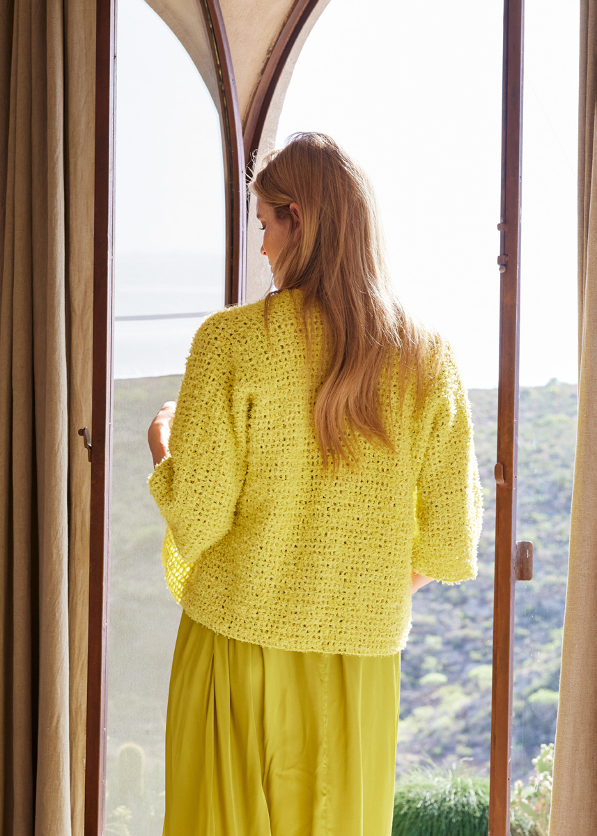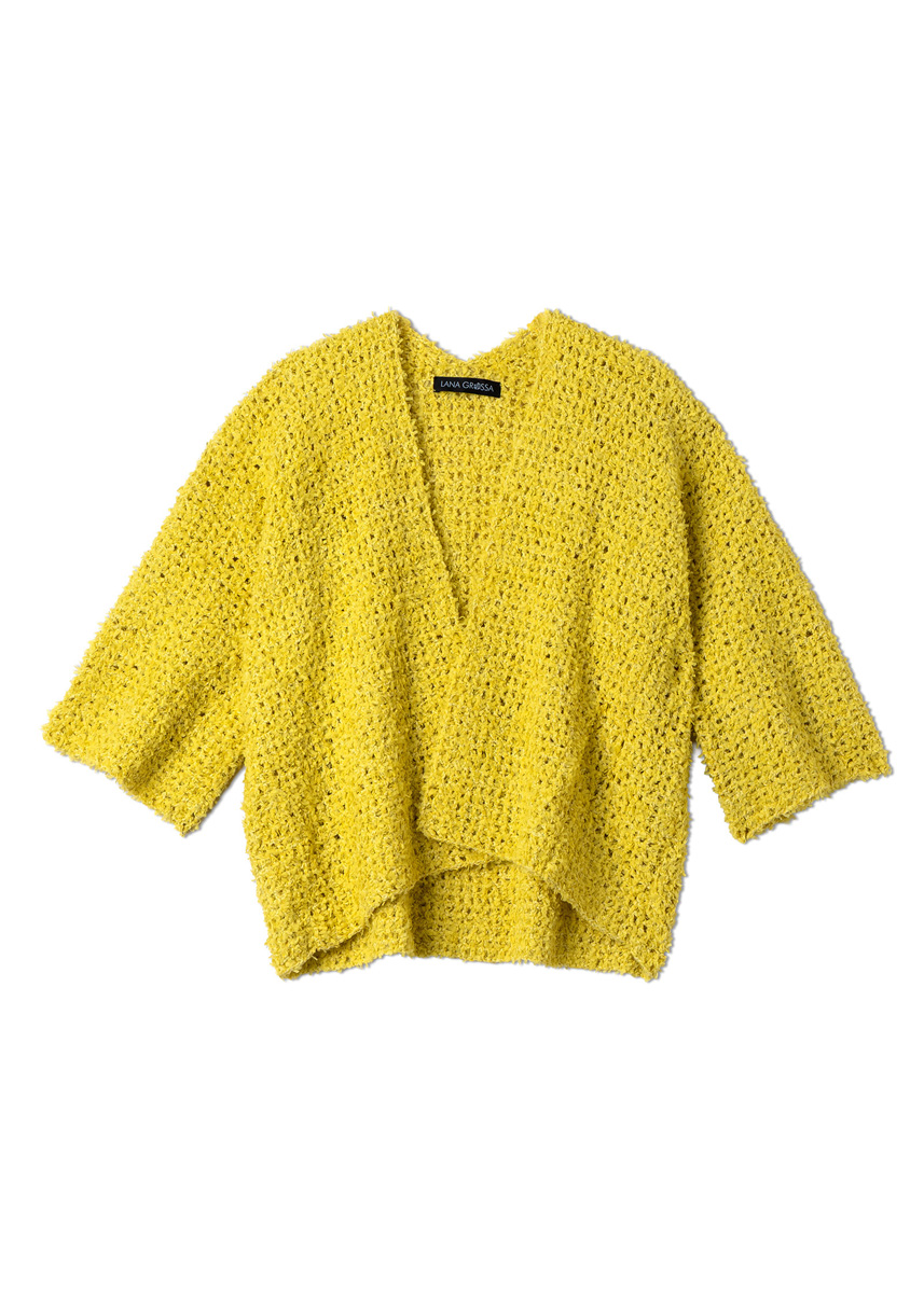 Lana Grossa, qualità Frizzante (54% cotone, 46% poliammide, 50 gr. = 105 mt.): 400 (450 - 500 - 550) gr. col. giallo limone n. 10; uncinetto n. 3,50.