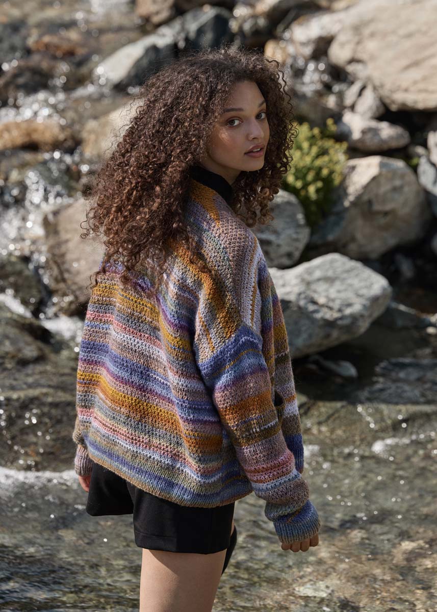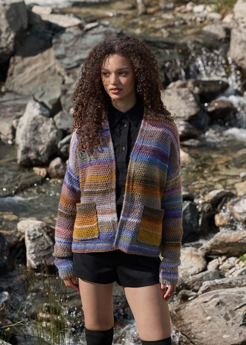 Lana Grossa, qualità “Gomitolo Intenso” (50% lana verine, 50% poliacrilico, 200 gr. = 700 mt.): 2 (2 - 3 - 3) gom. = 400 (400 - 600 - 600) gr. giallo uovo/giallo senape/guscio d’uovo/grigio-beige/viola/jeans/grigio chiaro/ grigio n. 235; ferri n. 3,5 e n. 4,5.