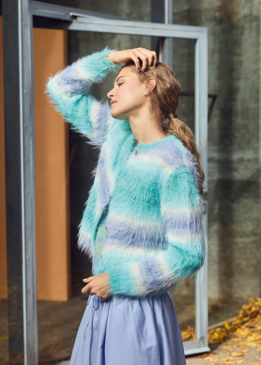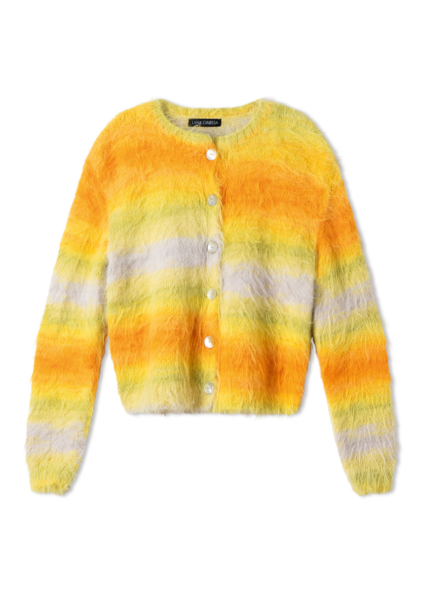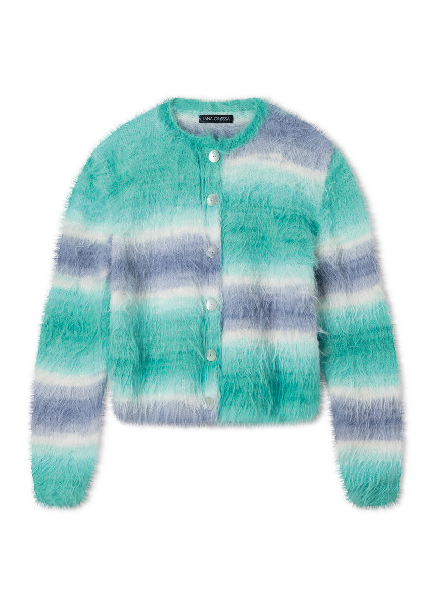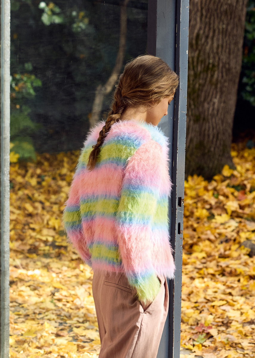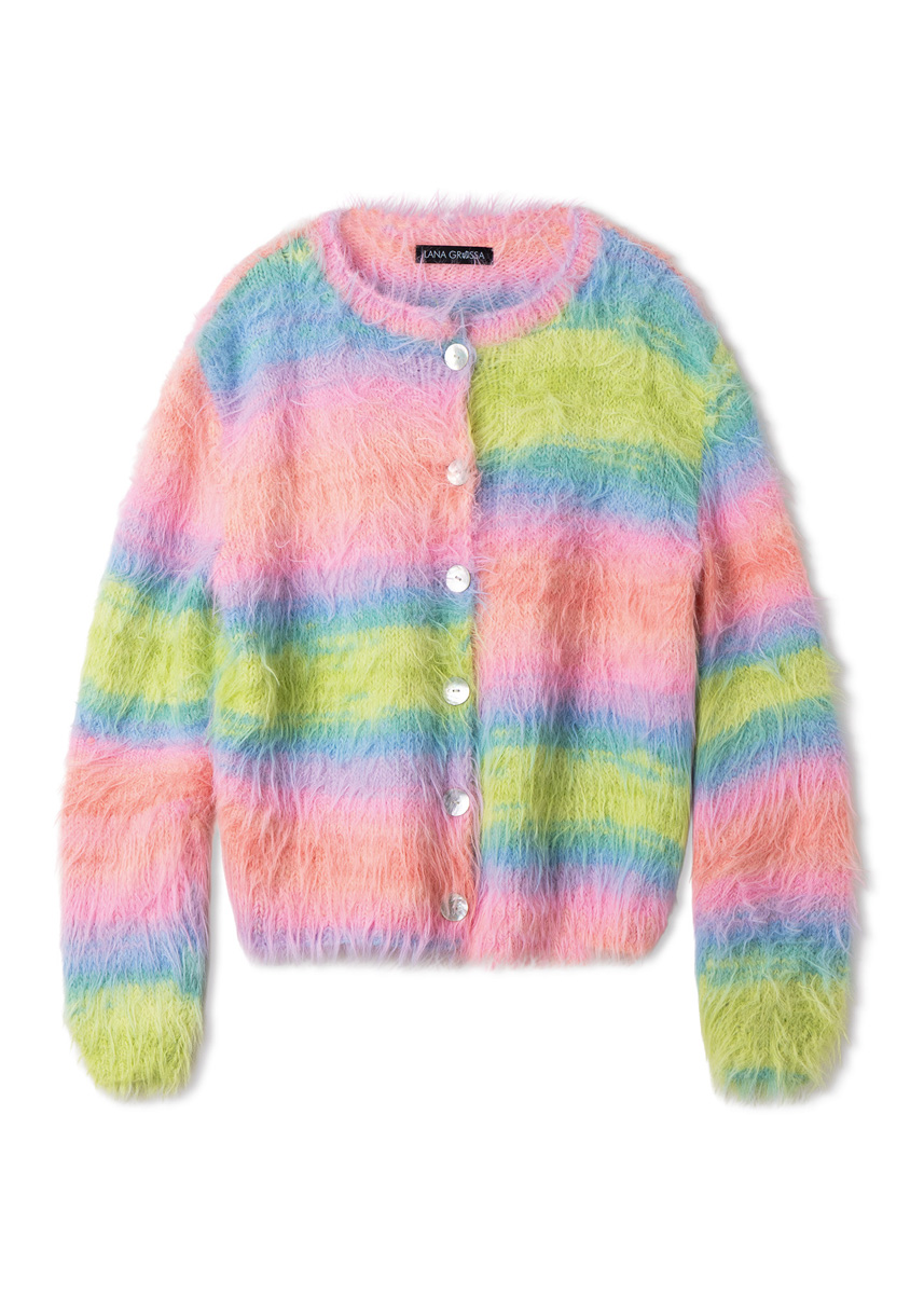 Lana Grossa, qualità Basta Mista (50% lana vergine (merino), 50% poliammide, 50 gr. = 100 mt.: 450 (500 - 550 - 600) gr. col. lime/turchese/acqua/salmone/ rosa/lilla n. 113; ferri n. 4 e n. 4,5; 1 ferro circolare corto n. 4; 6 bottoni di madreperla, diametro 20 mm.