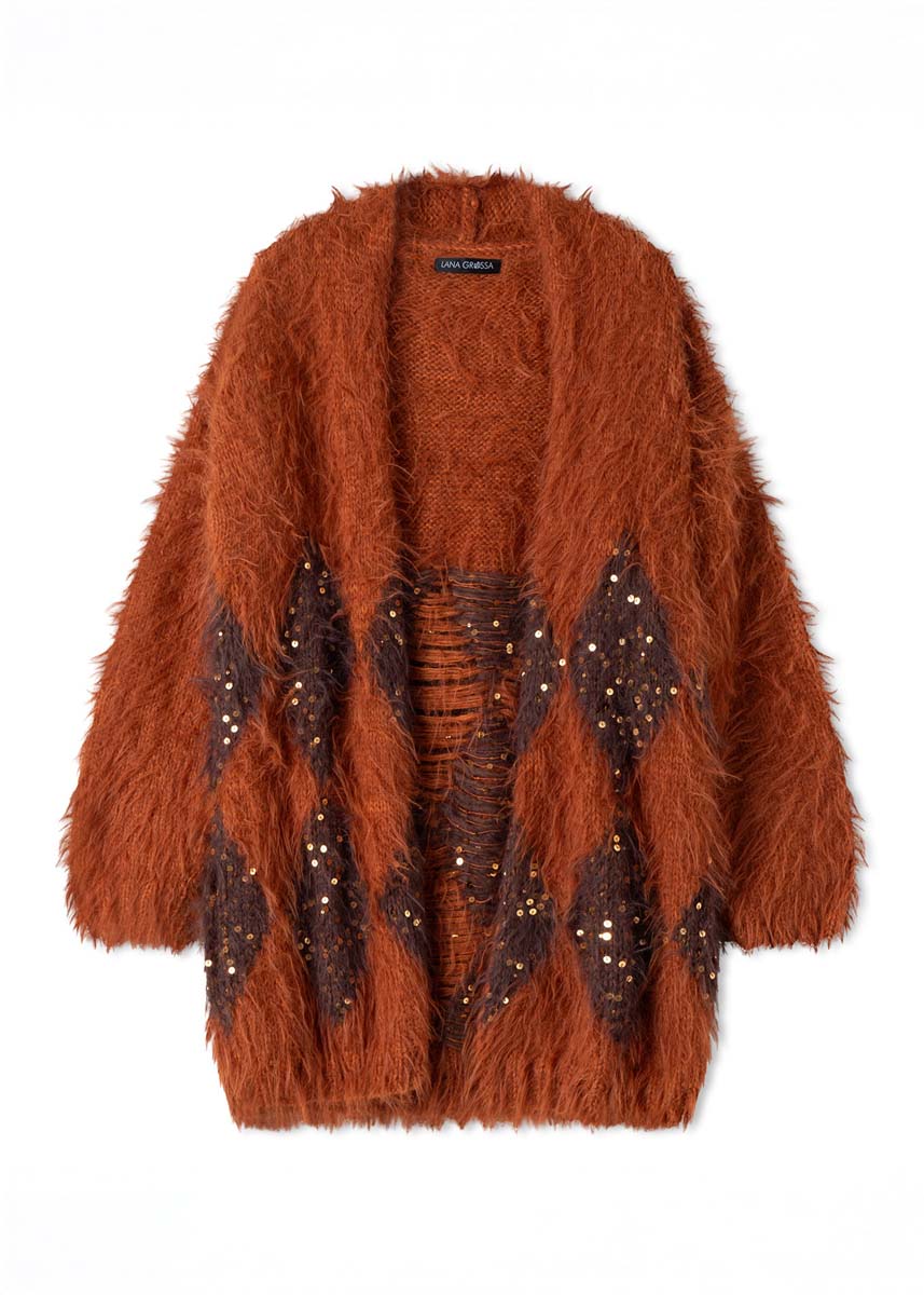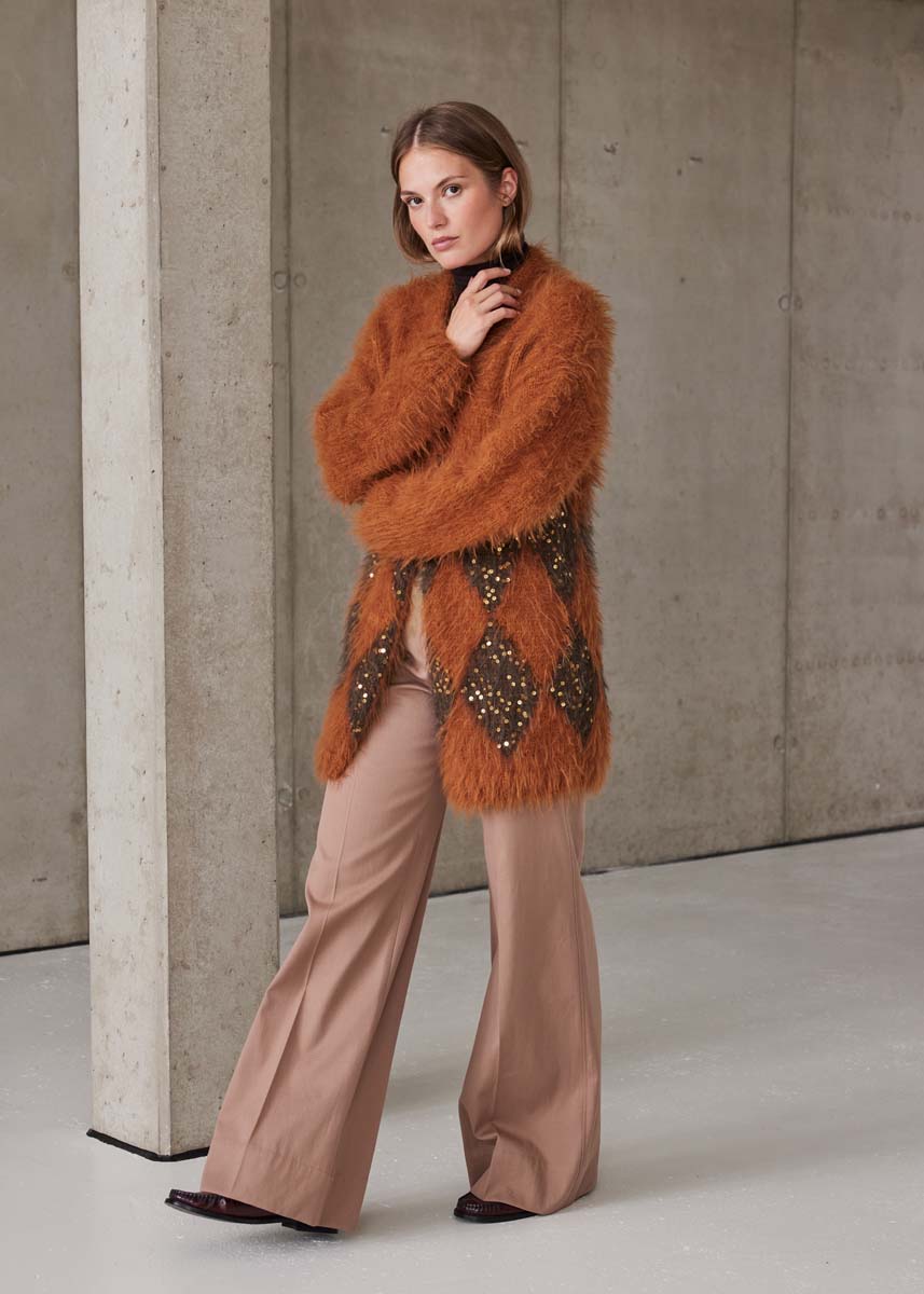 Lana Grossa, di cui qualità Ecopuno (72% cotone, 17% lana vergine merino, 11% alpaca baby, 50 gr. = 215 mt.): 200 (300) gr. col. ruggine n. 223; qualità Basta (50% lana vergine merino, 50% poliammide, 50 gr. = 100 mt.): 450 (550) gr. col. marrone-ruggine n. 5 e 150 gr. col. cioccolato n. 33 e qualità Cosmo (100% cotone con paillette, 100 gr. = 260 mt.): 100 gr. col. caramello n. 8; ferri n. 7; 2 ferri ausiliari.