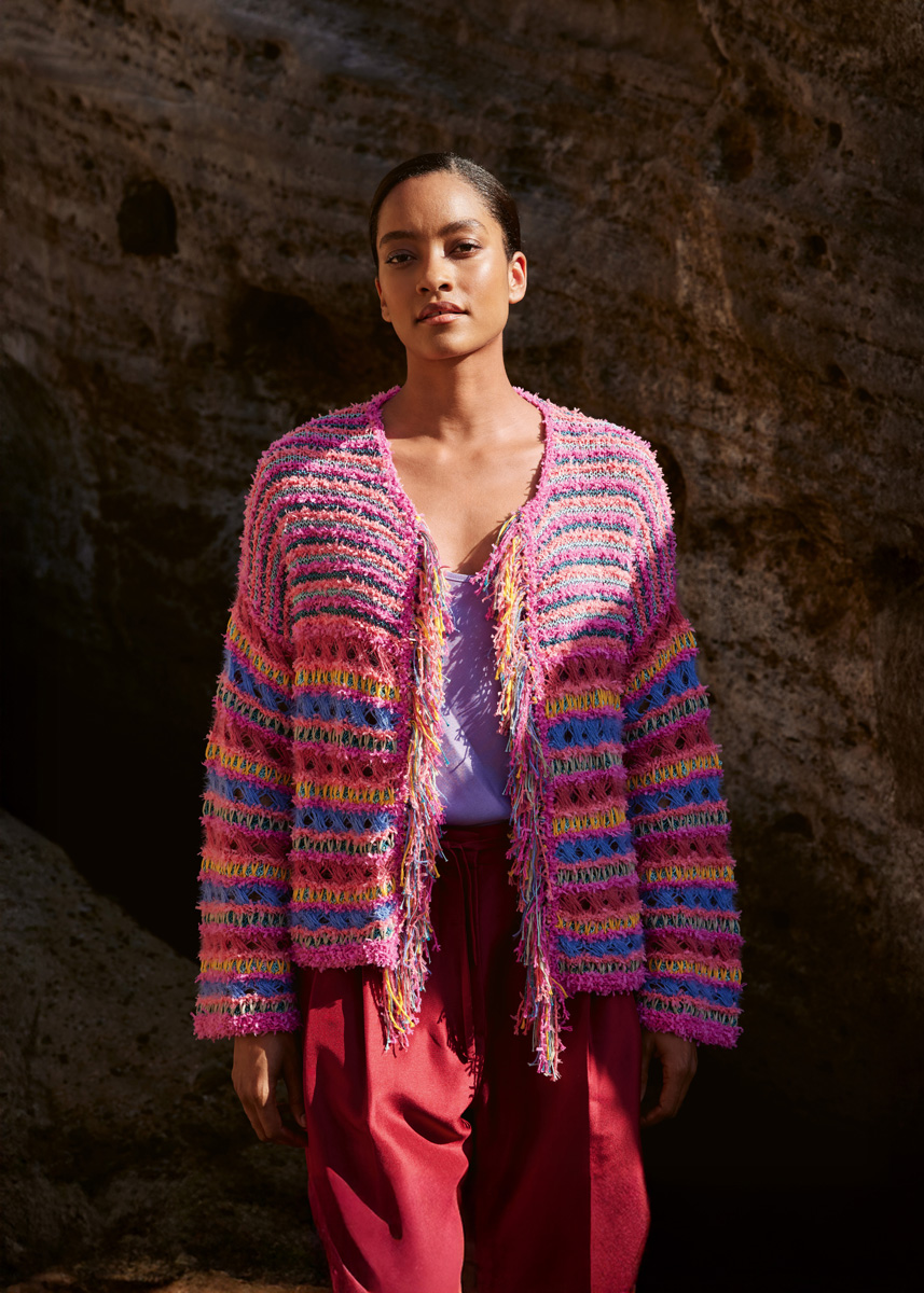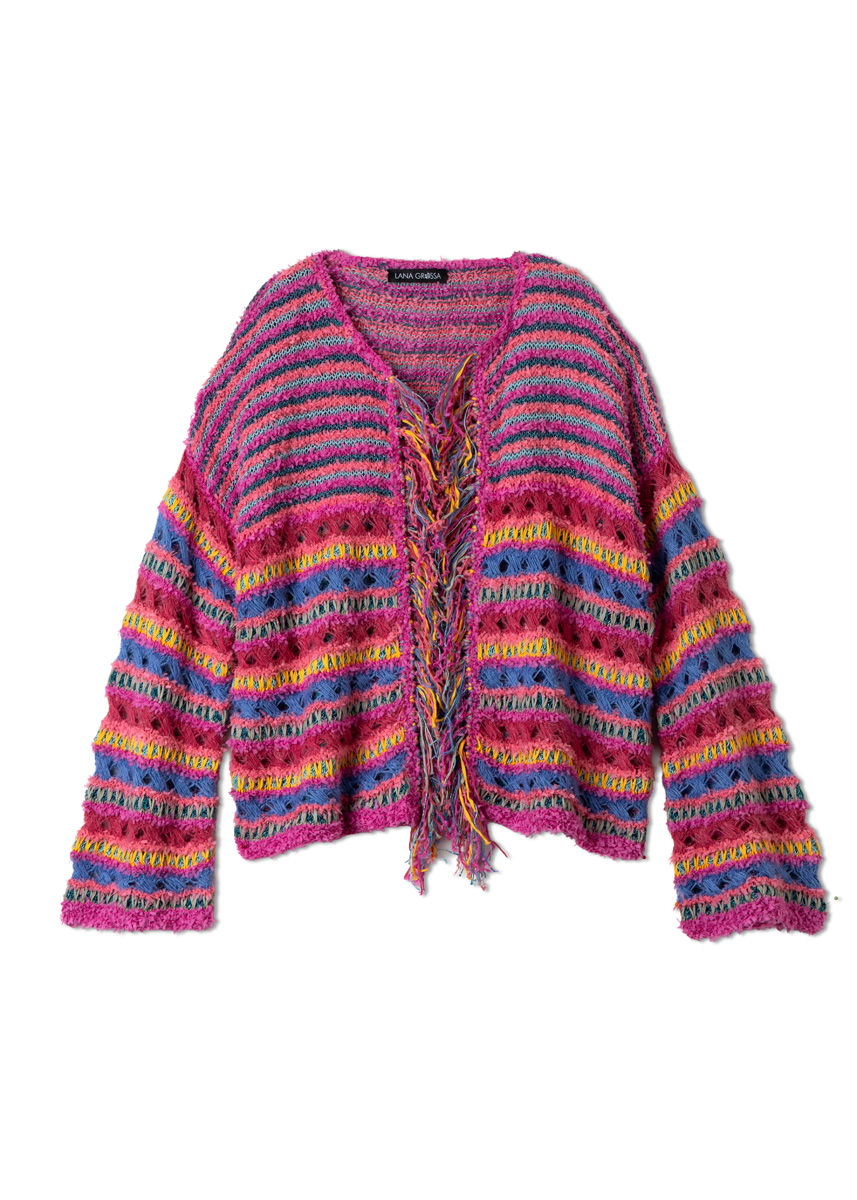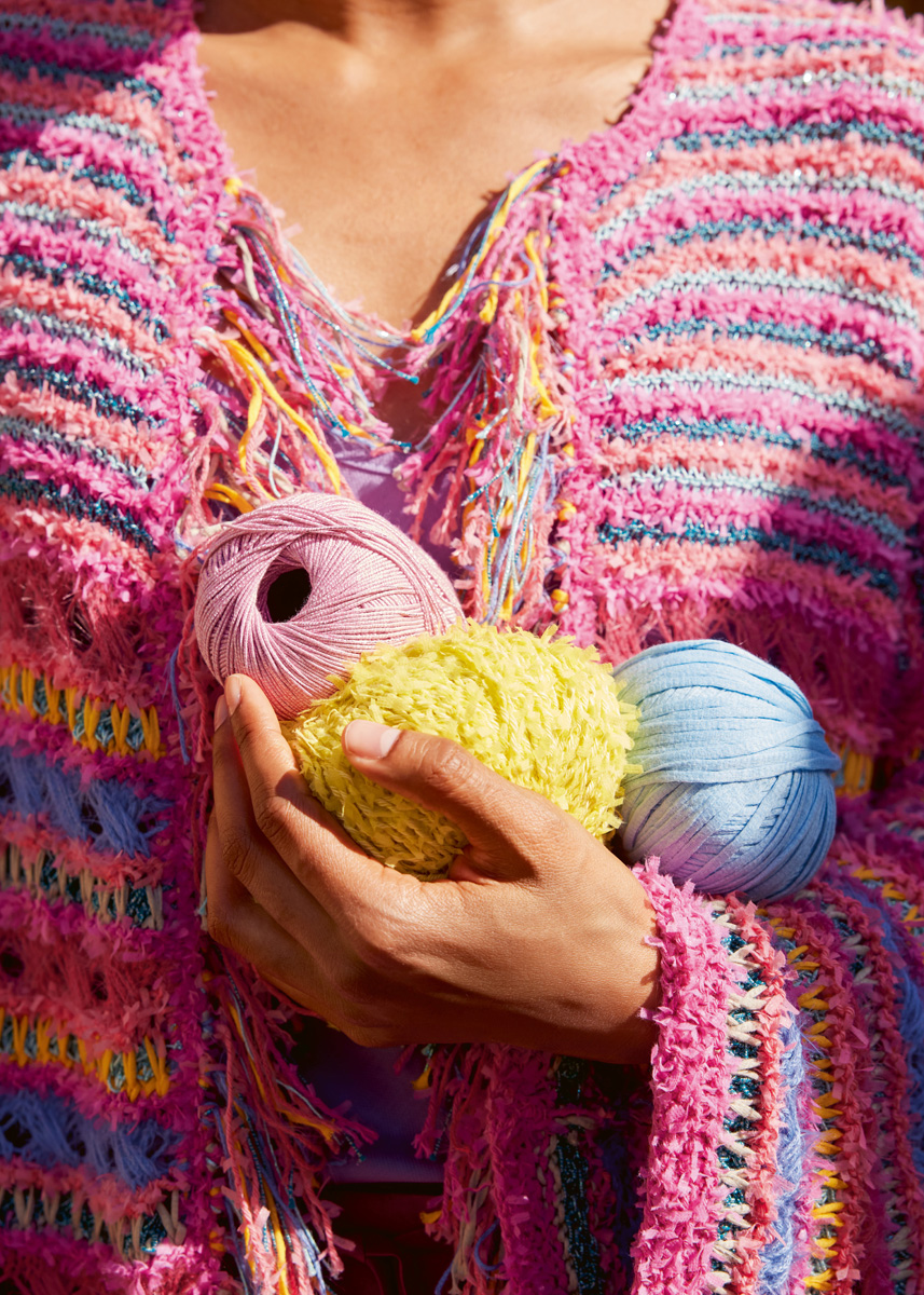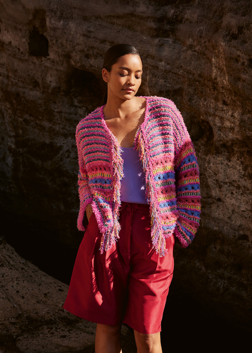 Lana Grossa, di cui qualità Frizzante (54% cotone, 46% poliammide, 50 gr. = 105 mt.): 150 (150 - 200 - 200) gr. col. fucsia n. 14 e 100 (100 - 150 - 150) gr. col. lampone n. 13; qualità Filo Lurex (94% cotone, 6% poliestere, 50 gr. = 145 mt.): 100 (100 - 150 - 150) gr. per ciascuno dei colori: petrolio n. 10 e turchese n. 11; qualità Tessera (100% cotone, 50 gr. = 115 mt.): 50 gr. per ciascuno dei colori: verde salvia n. 1 e arancione n. 5 e qualità Per Fortuna (74% cotone (Bio), 26% poliammide, 50 gr. = 190 mt.): 50 gr. per ciascuno dei colori: blu violetta n. 62 e col. lampone n. 63; ferri n. 4 e n. 4,5; uncinetto n. 3,50; ferro ausiliario.