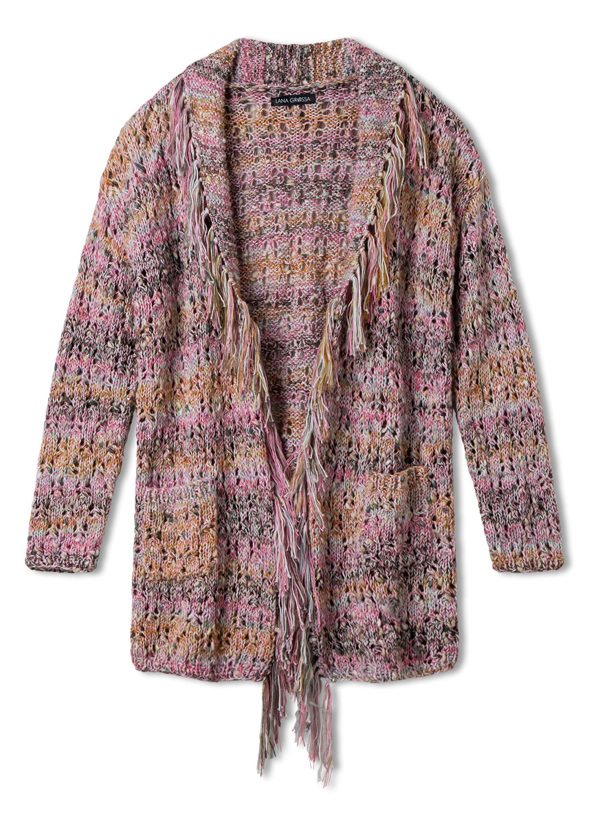 Lana Grossa, di cui qualità Cottonhair (70% mohair (superkid), 30% cotone, 50 gr. = 450 mt.): 100 (150 - 150) gr. col. senape/rosa antico/fango/menta- turchese/ocra n. 109, qualità Filo Paillettes (55% cotone, 39% poliestere, 6% poliammide, 50 gr. = 155 mt.): 300 (300 - 350) gr. col. rosa n. 7 e qualità Popcorn (100% cotone, 50 gr. = 125 mt.): 650 (700 - 750) gr. col. argento/beige/grigio/grigio scuro n. 10; ferri n. 6; uncinetto per le frange; 2 ferri ausiliari.