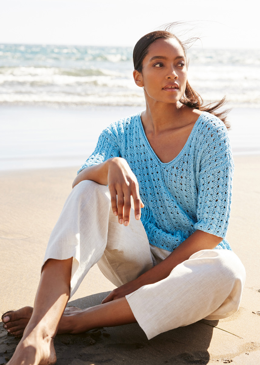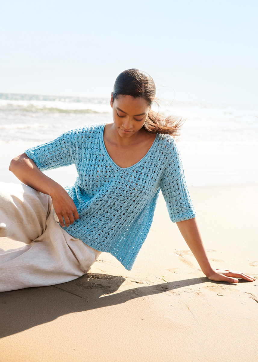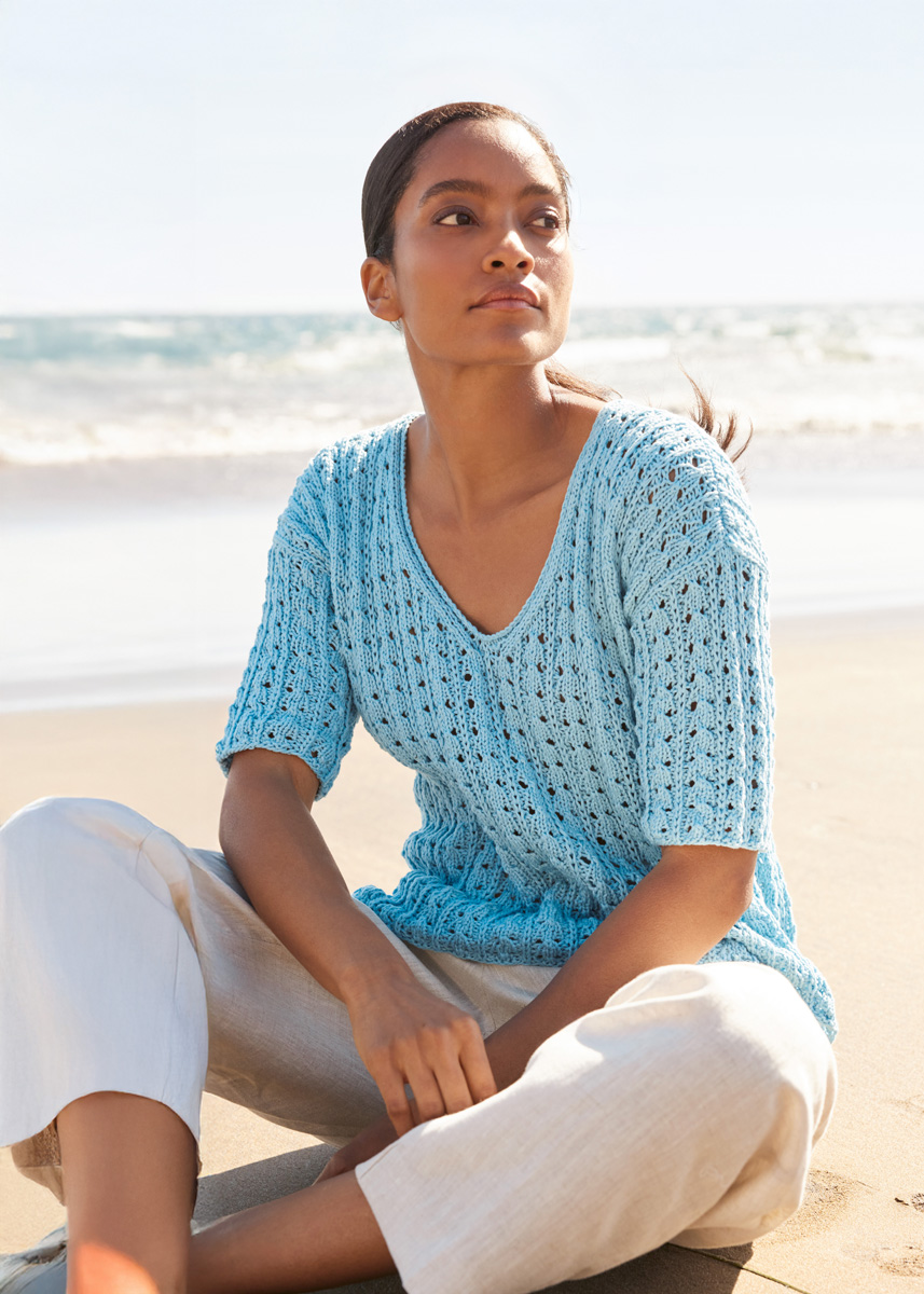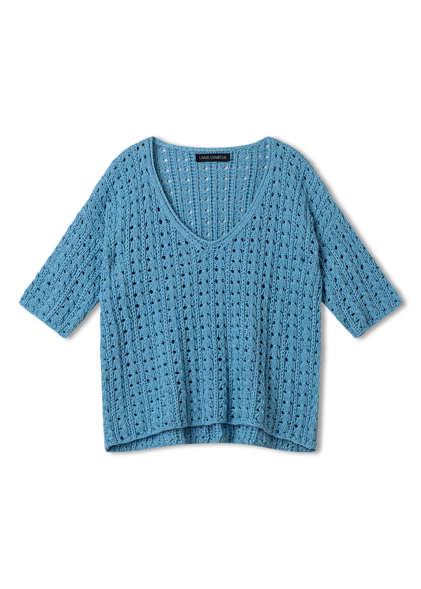 Lana Grossa, qualità Tessera (100% cotone, 40 gr. = 115 mt.): 400 (450 - 500) gr. col. azzurro n. 13; ferri n. 5; ferro circolare n. 5, lungo 50 cm.