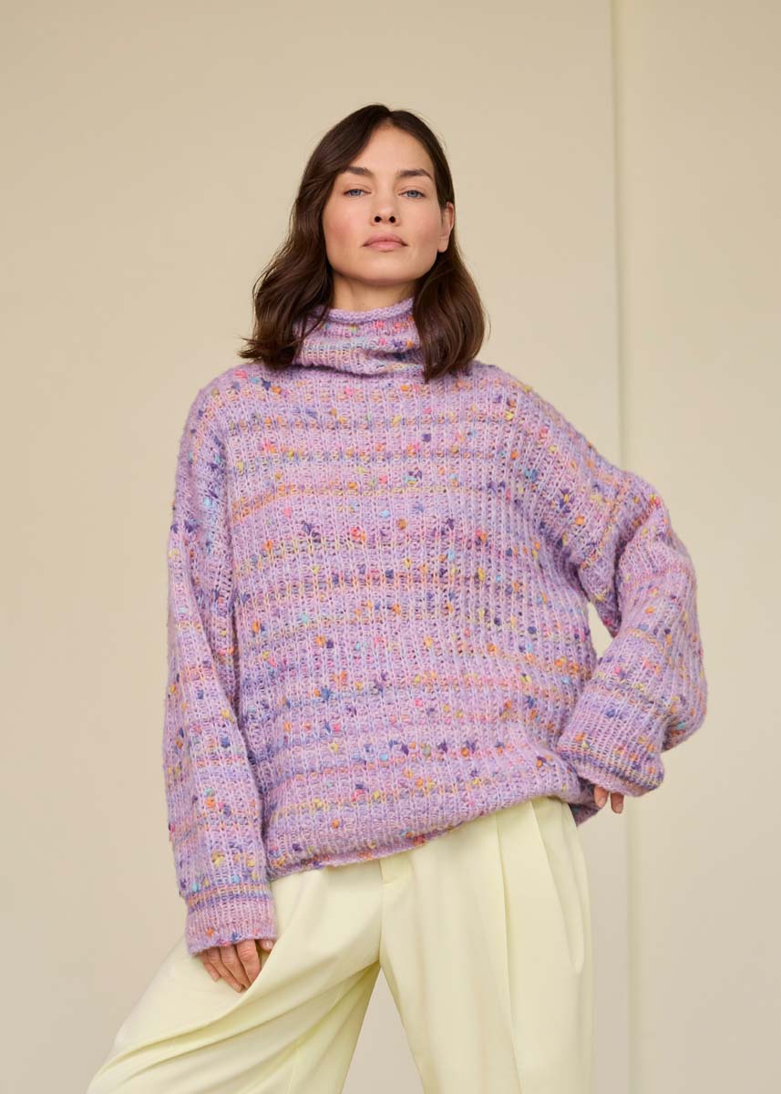 Lana Grossa, qualità “Cassata” (54% lana vergine merino extrafine, 30% poliammide, 16% cotone, 50 gr. = 175 mt.): 300 (350 - 350 - 400) gr. col. lilla chiaro/rosa/ giallo/lilla n. 3; ferri n. 5 e 5,5; ferro circolare corto n. 5.
