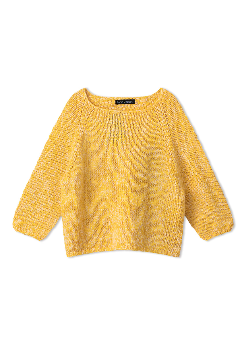 Lana Grossa, di cui qualità Summer Softness (80% cotone (Bio), 20% lana vergine (merino superfine), 50 gr. = 130 mt.): 250 (300 - 350 - 400) gr. col. giallo uovo n. 21 e qualità Setasuri Pearls (50% alpaca (Suri), 22% seta, 16% cotone, 12% vetro, 25 gr. = 140 mt.): 75 (100 - 100 - 125) gr. col. beige chiaro n. 201; un ferro circolare lungo e uno corto n. 7; segna-maglie.