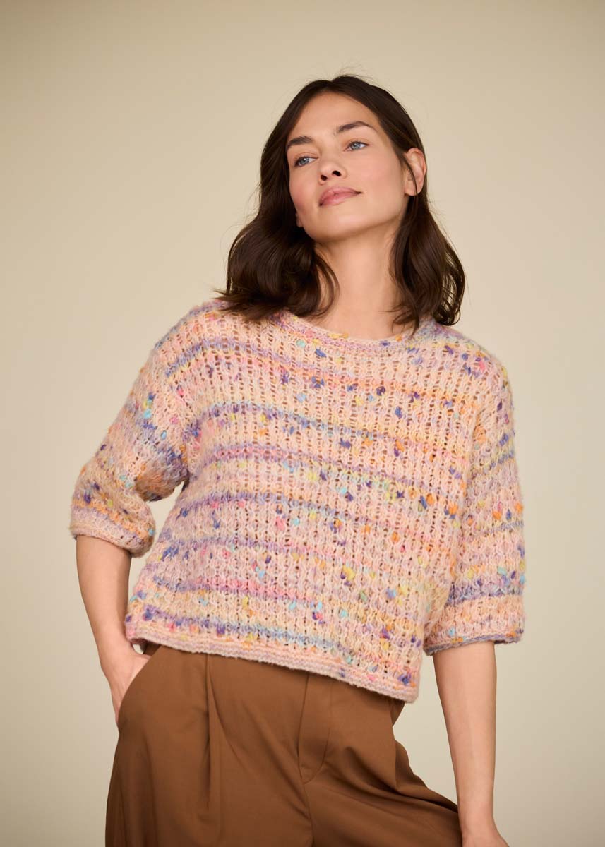 Lana Grossa, qualità “Cassata” (54% lana vergine merino extrafine, 30% poliammide, 16% cotone, 50 gr. = 175 mt.): 150 (200 - 200 - 250) gr. col. pesca/blu/giallo/arancione/ lillà n. 1; ferri n. 4,5 e n. 6; ferro circolare corto n. 4,5.