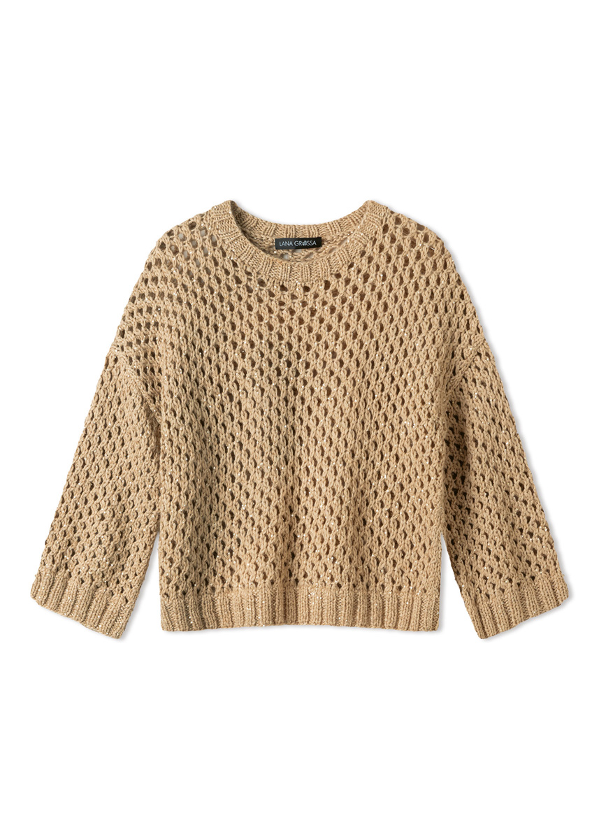 Lana Grossa, di cui qualità Summer Softness (80% cotone (Bio), 20% lana vergine (merino superfine), 50 gr. = 130 mt.): 300 (350 - 400 - 450) gr. col. crema n. 2 e qualità Glamour (55% poliammide, 45% poliestere, 25 gr. = 115 mt.): 125 (125 - 150 - 150) gr. col. beige n. 10; ferri n. 5 e n. 6; 1 ferro circolare corto n. 5.