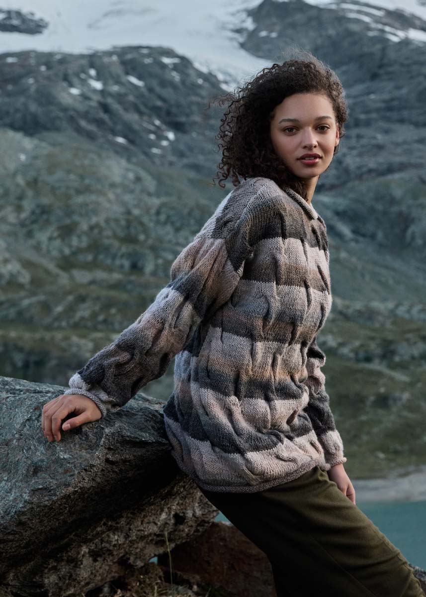 Lana Grossa, qualità “Gomitolo Fumo” (50% lana verine, 50% poliacrilico, 200 gr. = 700 mt.): 2 (3) gom. = 400 (600) gr. col. grigio chiaro/grigio medio/grigio scuro/grège/antracite n. 518; ferri n. 4,5 e 5; ferro circolare corto n. 4,5; ferro ausiliario