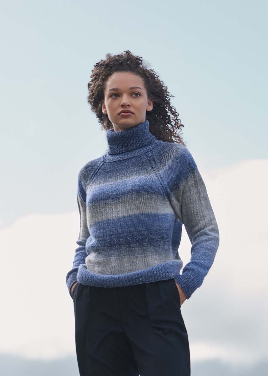 Lana Grossa, qualità “Gomitolo Gala” (60% lana verine, 38% poliacrilico, 2% poliestere, 200 gr. = 700 mt.): 2 (2 - 2 - 3) gom. = 400 (400 - 400 - 600) gr. col. grigio topo/grigio-blu/acciaio/blu marine/zaffiro/grigio chiaro n. 4030; ferri circolari n. 4 e n. 4,5 (uno lungo e uno corto per ogni misura); gioco di ferri n. 4 e n. 4,5.