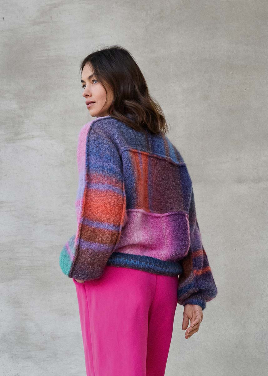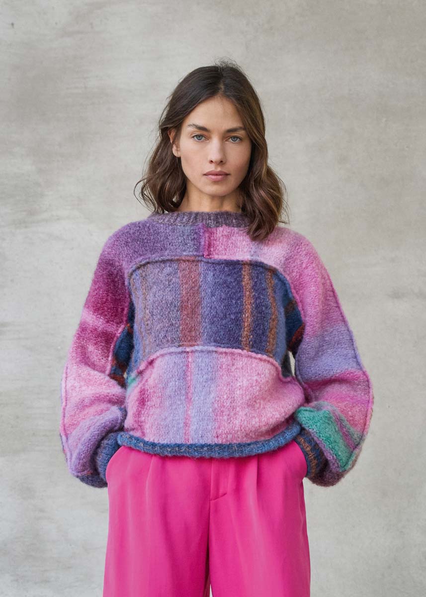 Lana Grossa, qualità “Gigante Multi” (70% alpaca fine, 30% poliammide, 50 gr. = 150 mt.): 200 (250 - 300 - 350) gr. col. grigio-marrone/petrolio/mandarino/ grigio-rosso/viola scuro/lilla n. 102 e 100 (150 - 150 - 200) gr. col. malva/garofano/pink/giada /grigio-rosso/vinaccia/mora/ violetto n. 107; ferri n. 6; gioco di ferri n. 5; ferro circolare lungo n. 5