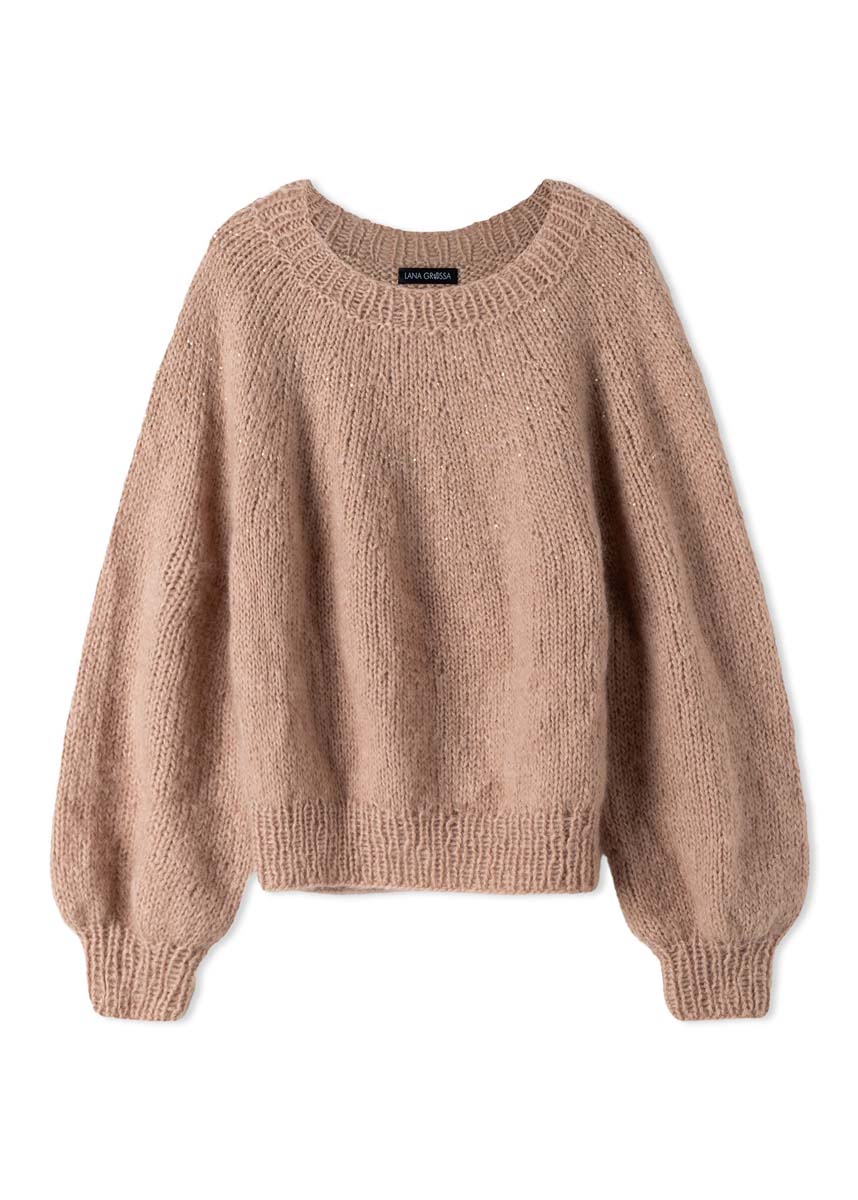 Lana Grossa, di cui qualità Mohair di Gio (55% superkid mohair, 45% lana vergine merino superfine, 50 gr. = 85 mt.): 500 (550 - 600) gr. col. beige n. 8 e qualità Glamour (55% poliacrilico, 45% poliestere, 50 gr. = 112 mt.): 25 gr. col. beige n. 10; ferri circolari n. 7 (uno lungo 60 cm e uno lungo 100 cm); gioco di ferri n. 7; ferri circolare n. 8 (uno lungo 50 cm, uno lungo 80 cm, uno lungo 100 cm e uno lungo 120 cm); 20 segna-maglie (SM); 2 ferri ausiliari.
