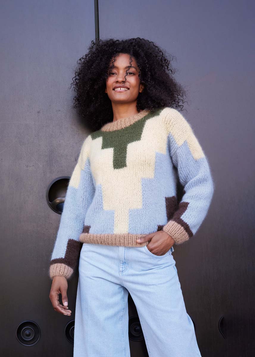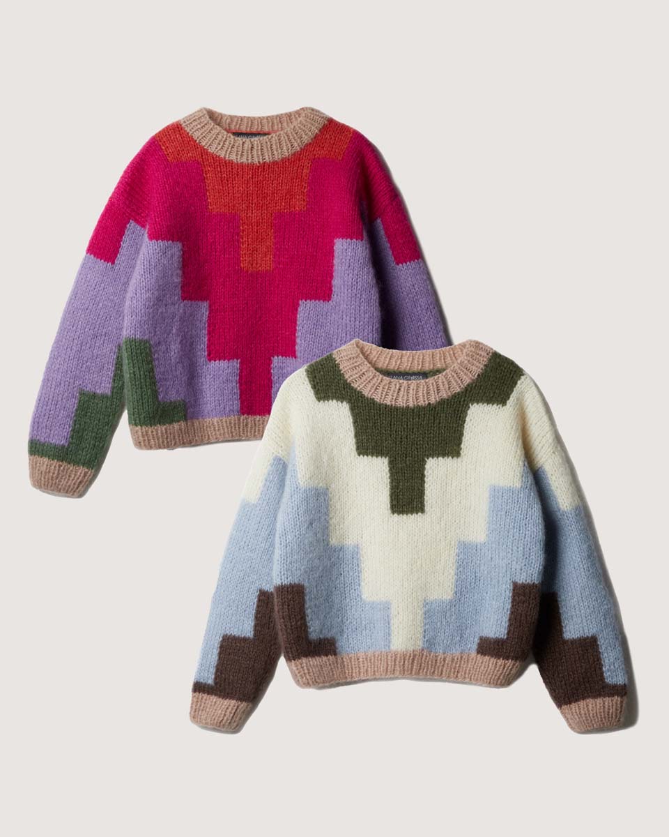 Lana Grossa, qualità Mohair di Gio (55% superkid mohair, 45% lana vergine merino superfine, 50 gr. = 85 mt.): 200 (250 - 250) gr. col. lilla n. 1, 100 (150 - 150) gr. col. pink n. 3, 100 (150 - 150) gr. col. pink verde reseda n. 13, 50 (50 - 100) gr. col. arancione n. 6 e 50 gr. col. beige n. 8; ferri n. 6 e n. 7; ferro circolare n. 6 lungo 50 cm.