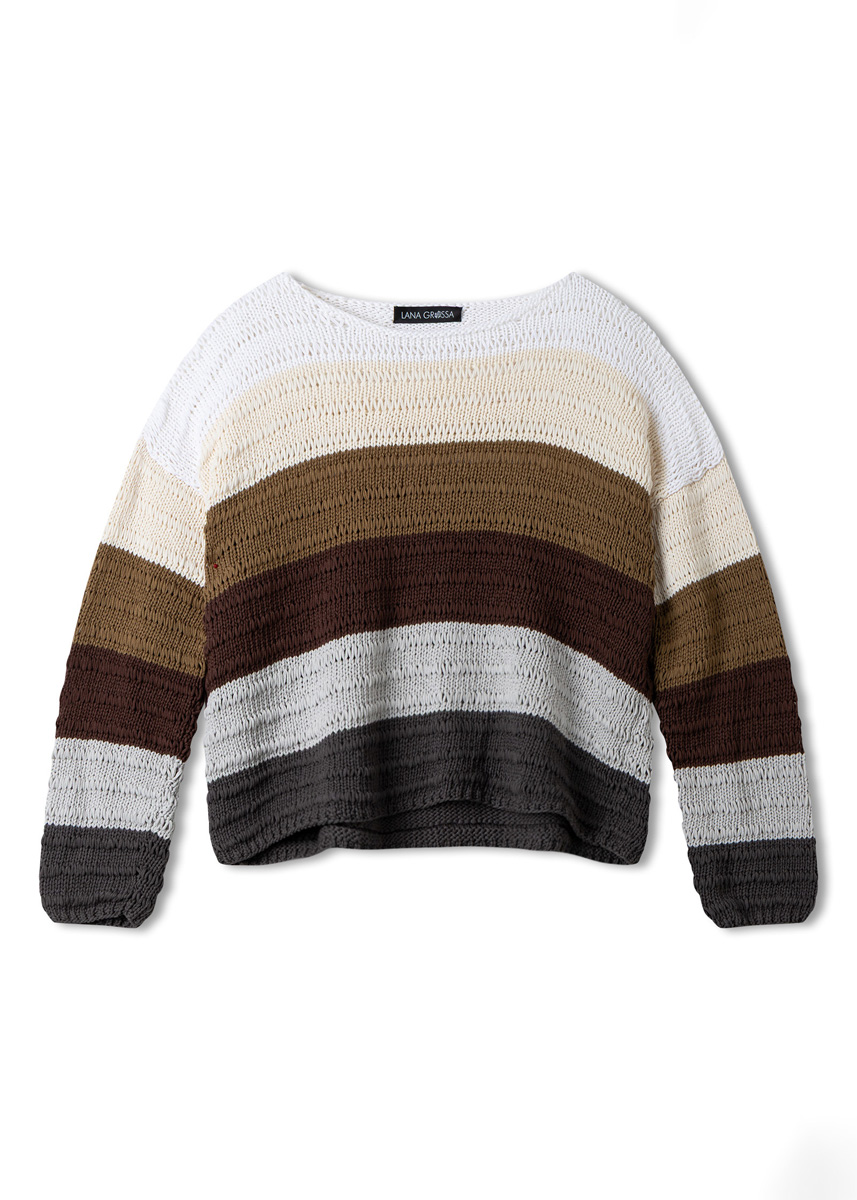 Lana Grossa, qualità Tessera (100% cotone, 50 gr. = 115 mt.): 100 (100 - 100 - 100) gr. per ciascuno dei colori: bianco. n. 20, verde-marrone n. 18, marrone scuro n. 17 e argento n. 14 e 100 (100 - 150 - 150) gr. per ciascuno dei colori: crema n. 19 e grigio scuro n. 15; ferri n. 5,5; ferro circolare n. 5,5, lungo 40 cm.