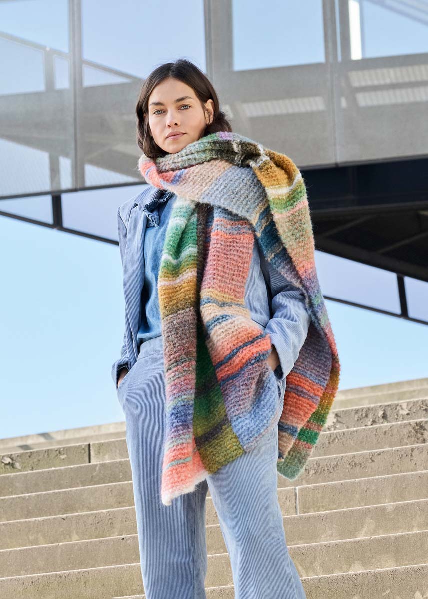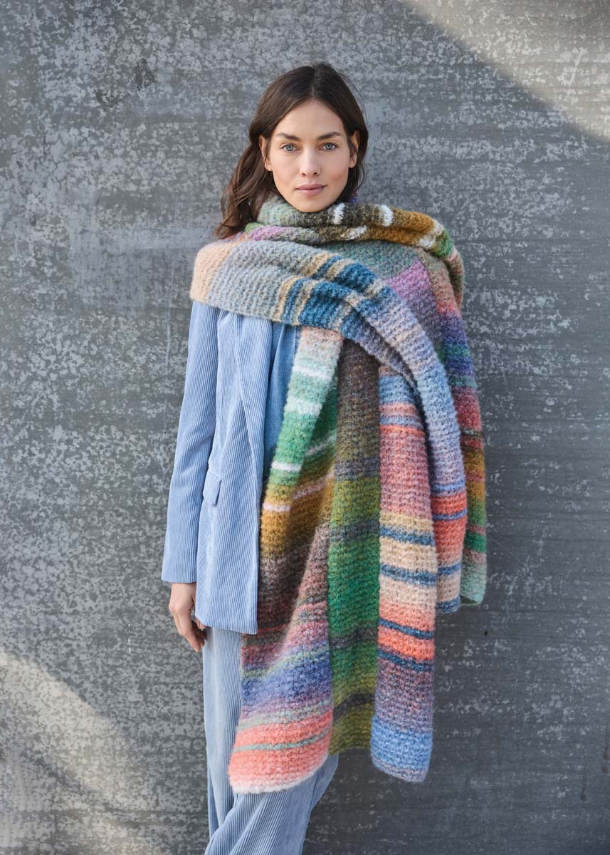 Lana Grossa, qualità “Gigante Multi” (70% alpaca fine, 30% poliammide, 50 gr. = 150 mt.): di cui 100 gr. col. grigio-blu/beige/grigio-rosso/mandarino/petrolio/ grigio-giallo n. 101, 100 gr. col. grigio-verde/viola/jeans scuro/ giallo-arancione/rosso geranio/verde oliva/verde muschio n. 105 e 100 gr. col. verde oliva scuro/verde oliva chiaro/rosa/ grigio verde/verde/mora/viola antico n. 106; ferri n. 6,5.