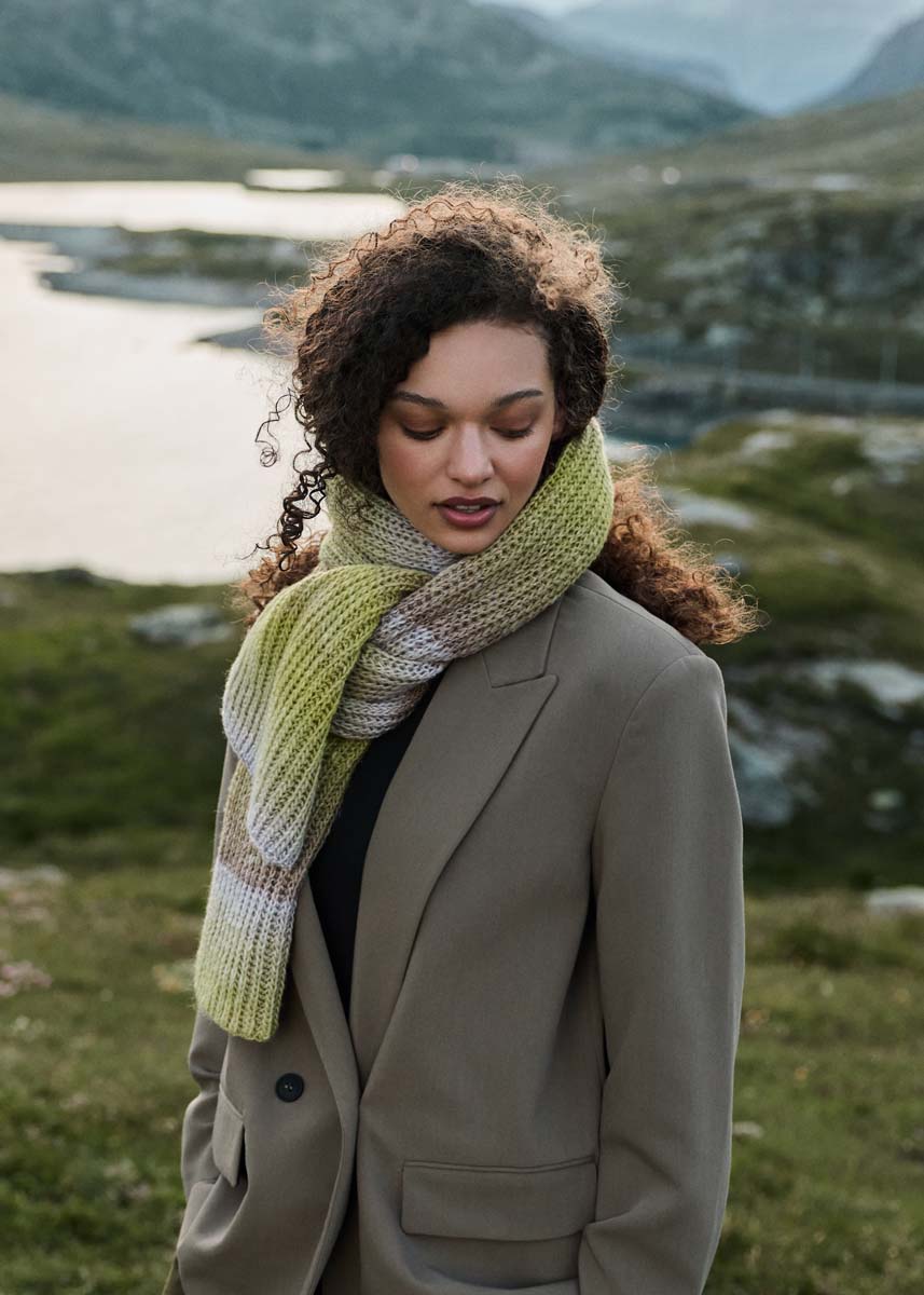 Lana Grossa, qualità “Gomitolo Gala” (60% lana verine, 38% poliacrilico, 2% poliestere 200 gr. = 700 mt.): 1 gom. = 200 gr. col. viola-grigio/verde oliva scuro/ verde oliva chiaro/lime n. 4034; ferri n. 5.