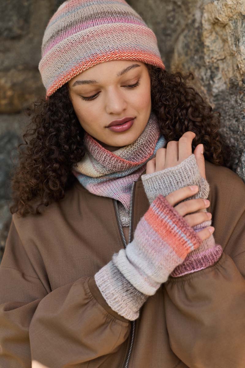 Lana Grossa, qualità “Gomitolo Intenso” (50% lana verine, 50% poliacrilico, 200 gr. = 700 mt.): 1 gom. = 200 gr. col. grigio chiaro/albicocca/giallo chiaro/ blu chiaro/rosa chiaro/grigio/grège/pesca n. 236; ferro circolare corto o gioco di ferri n. 4.