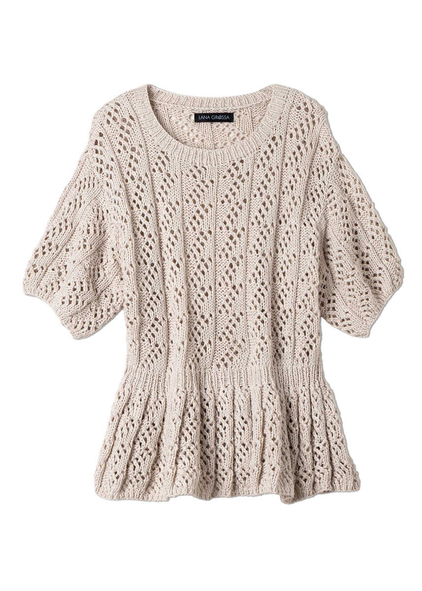 Lana Grossa, qualità Cotonella (100% cotone Pima, 100 gr. = 280 mt.): 400 (400 – 500) gr. col. beige pastello n. 202; ferri n. 3 e n. 5; ferro circolare n. 3, lungo 40 cm.