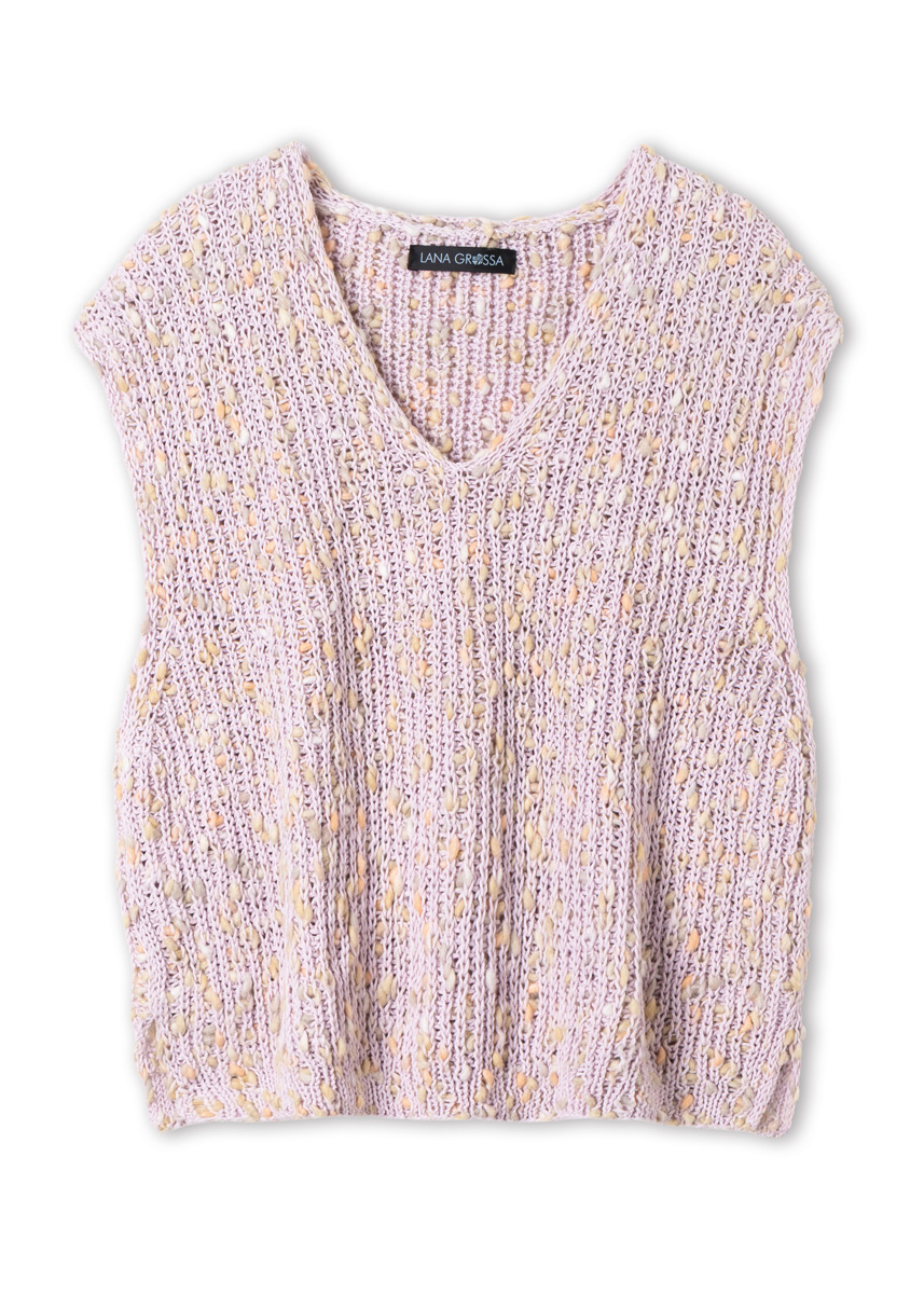 Lana Grossa, qualità Popcorn (100% cotone, 50 gr. = 125 mt.): 300 (350 - 350 - 400) gr. col. rosa pastello/ giallo chiaro/grigio chiaro/pesca n. 4; ferri n. 4,5 e n. 5; 1 ferro circolare corto n. 4,5.