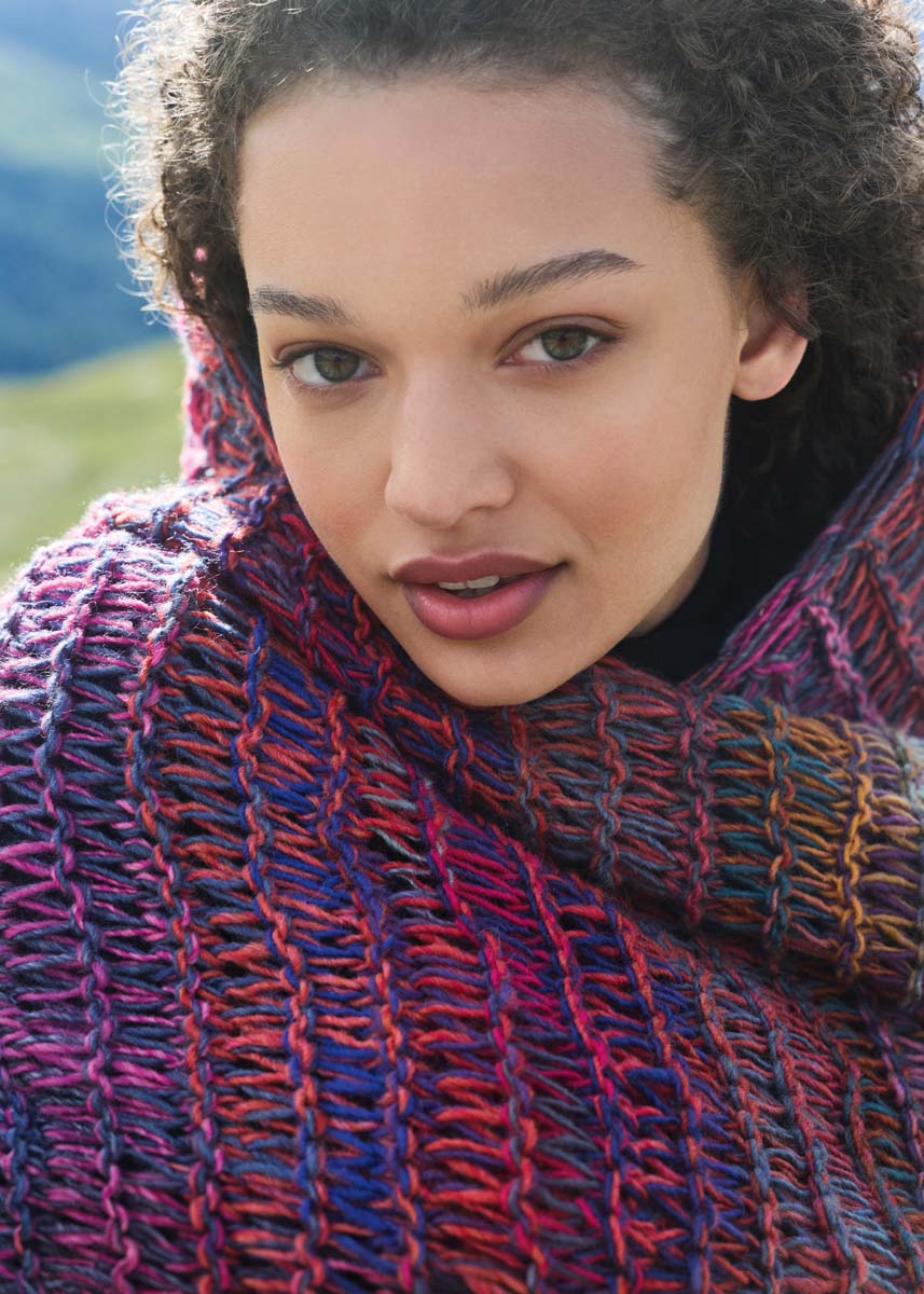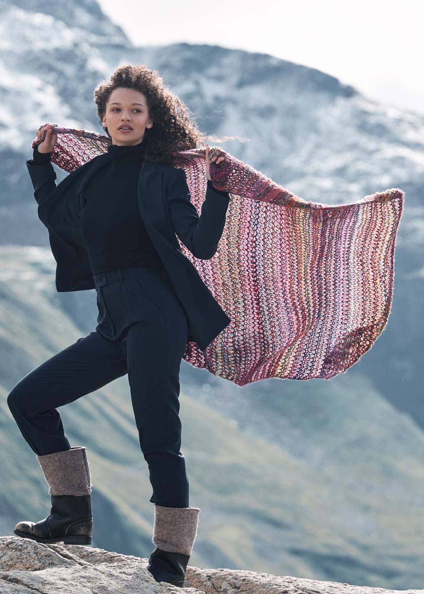 Lana Grossa, qualità “Gomitolo Intenso” (50% lana verine, 50% poliacrilico, 200 gr. = 700 mt.): 1 gom. = 200 gr. col. grigio scuro/blu scuro/grigio-blu/petrolio/legno di rosa/blu-viola/grigio-verde n. 231 e 1 gom. = 200 gr. col. pink/viola/ocra/oro/fragola/terracotta n. 238; ferri n. 9.