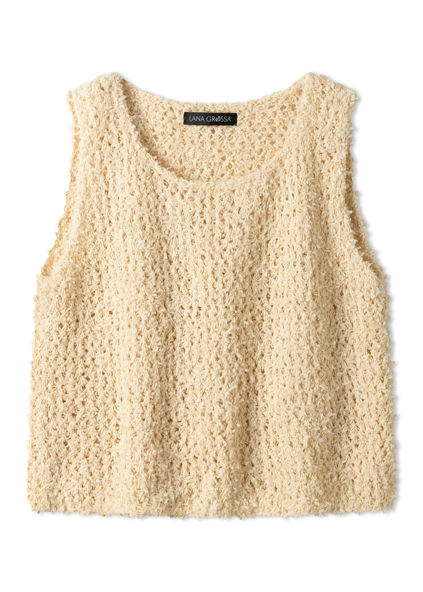 Lana Grossa, qualità Frizzante (54% cotone, 46% poliammide, 50 gr. = 105 mt.): 200 (200 - 250 - 250) gr. col. crema n. 1; ferri n. 5; uncinetto n. 5,00